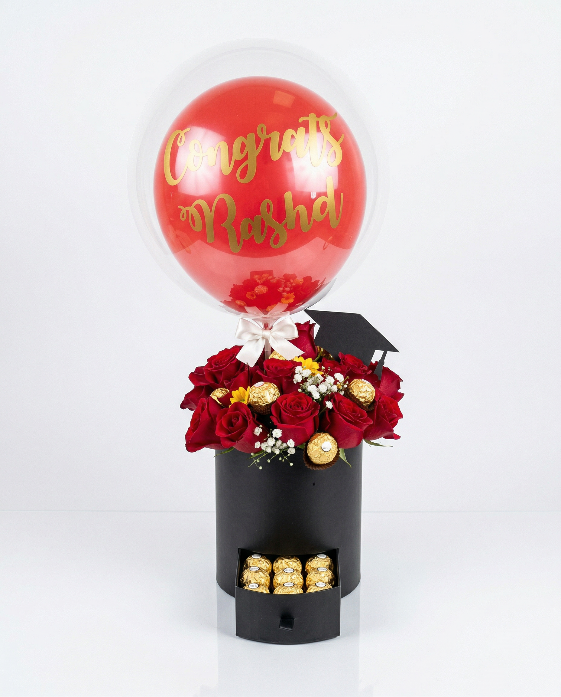 Globo Burbuja de Gala: Un globo transparente “burbuja” que protege un globo rojo interno, personalizado en vinil dorado con el nombre del graduado y un mensaje de felicitación (ej: “Congrats Rashd”).