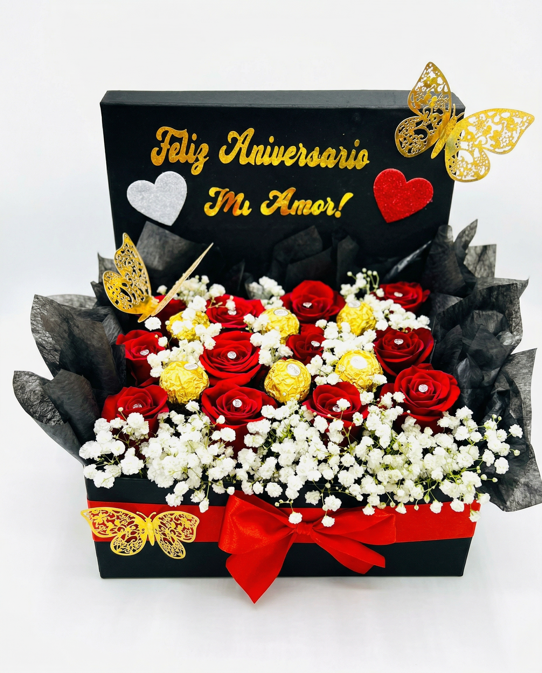 Mensaje Personalizado: La tapa interior de la caja funciona como pizarra para un mensaje en vinil dorado (ej: “Feliz Aniversario Mi Amor!”), acompañado de corazones en relieve rojo y plata.