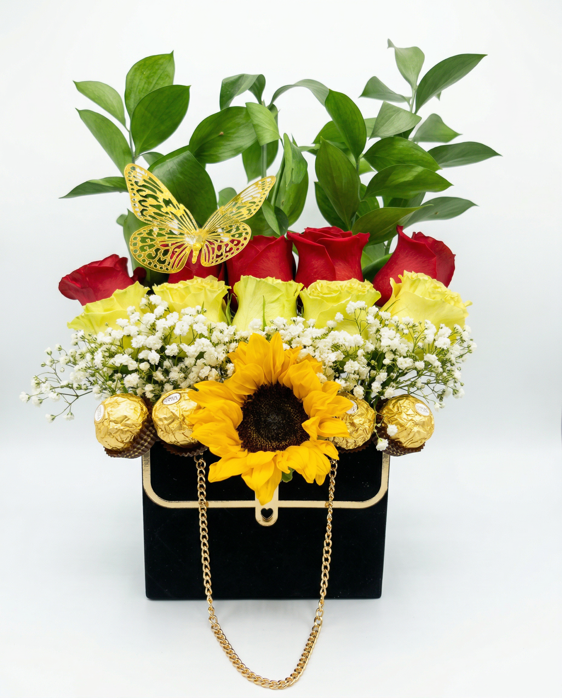 Centro de Atención: Un vibrante girasol que destaca en el frente, flanqueado por cuatro exquisitos bombones Ferrero Rocher que añaden un toque dulce y premium.