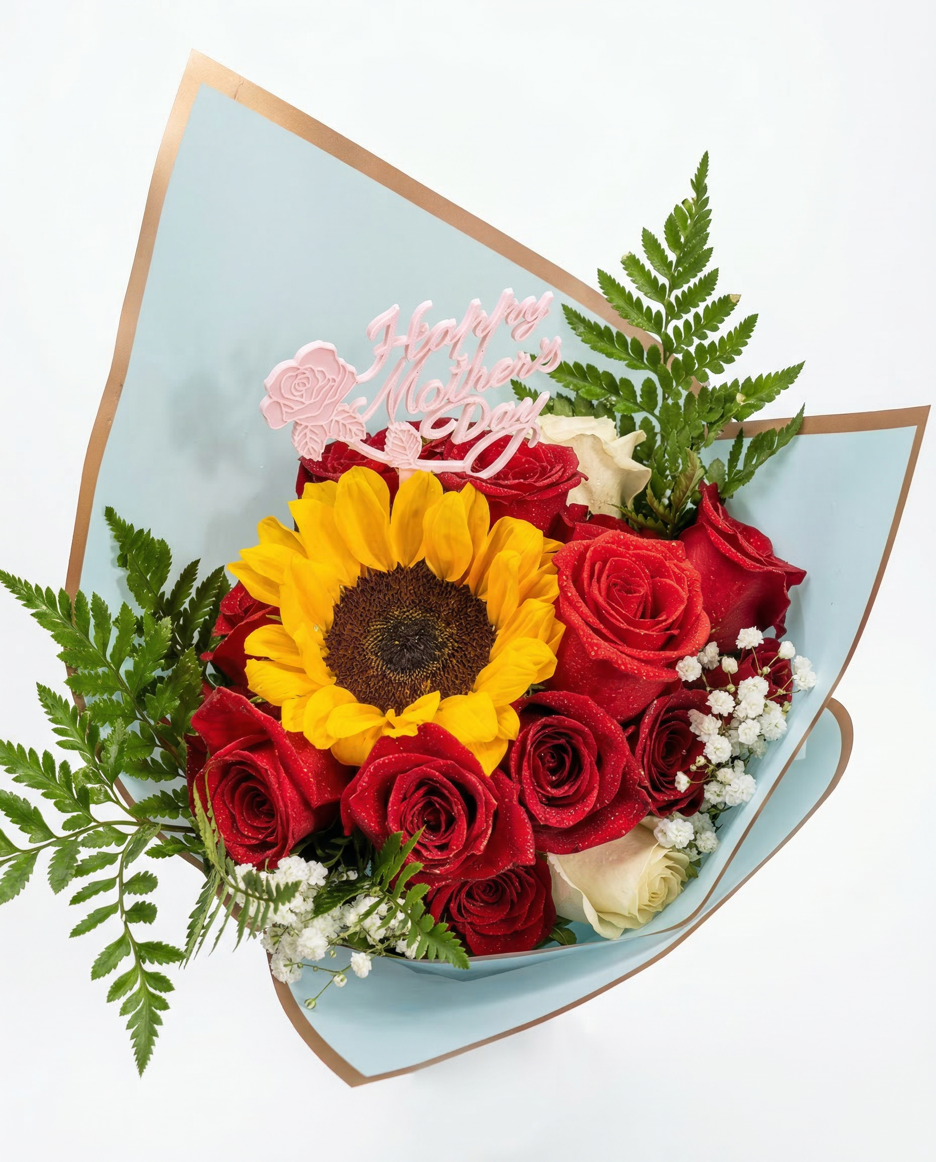 Detalles que marcan la diferencia: Cada ramo es confeccionado a mano por nuestros expertos floristas, seleccionando cada tallo para asegurar la máxima durabilidad. Además, este diseño permite la personalización del letrero superior (Topper), lo que lo hace perfecto para un cumpleaños, un aniversario o para celebrar a mamá.