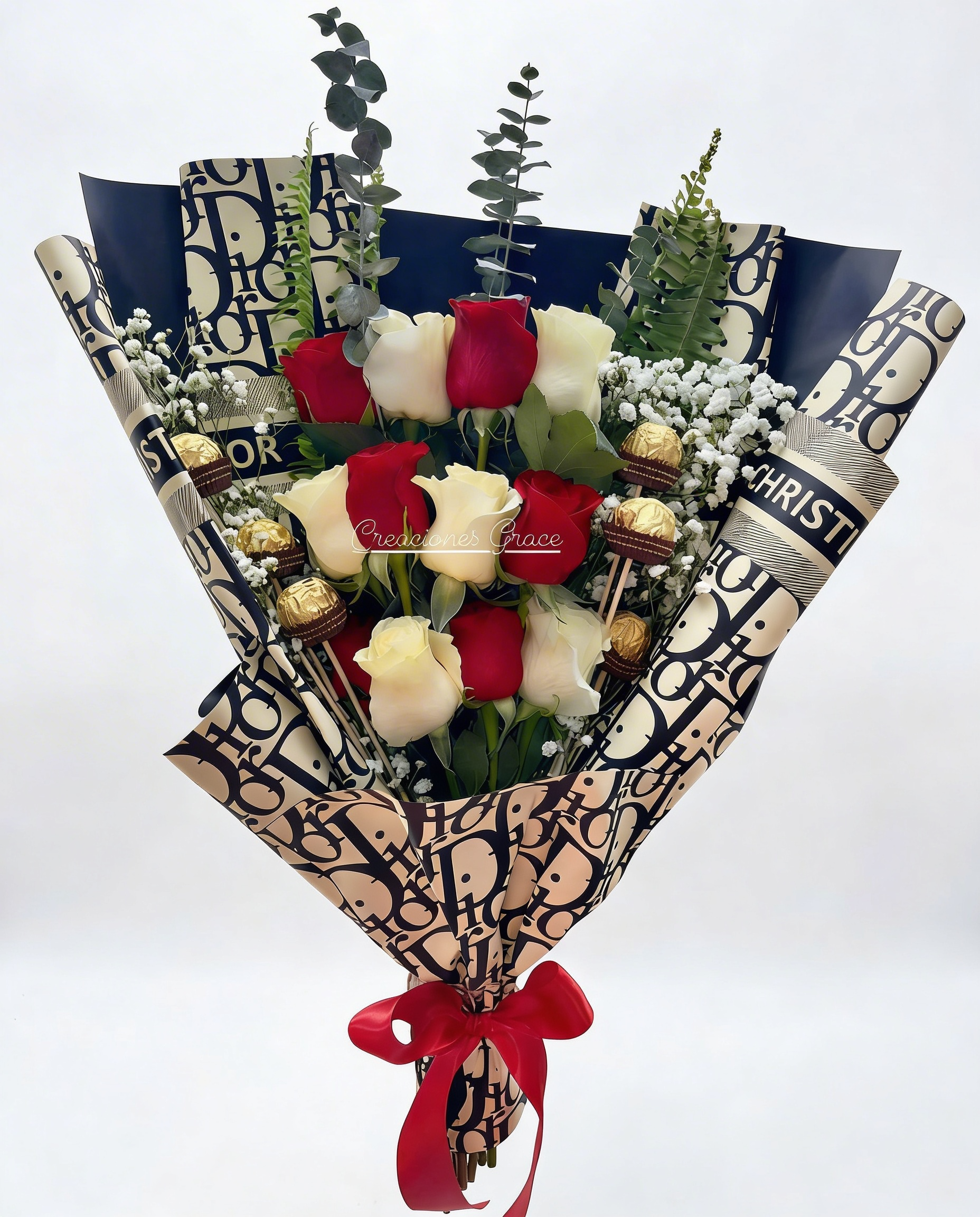 ¿Buscas el regalo perfecto? El Bouquet D’Elegance lo tiene todo: la pasión de las rosas rojas, la pureza de las blancas, el toque dulce de bombones premium y una presentación de alta gama inspirada en el mundo de la moda. Un detalle sofisticado y moderno diseñado para impresionar en cualquier ocasión.