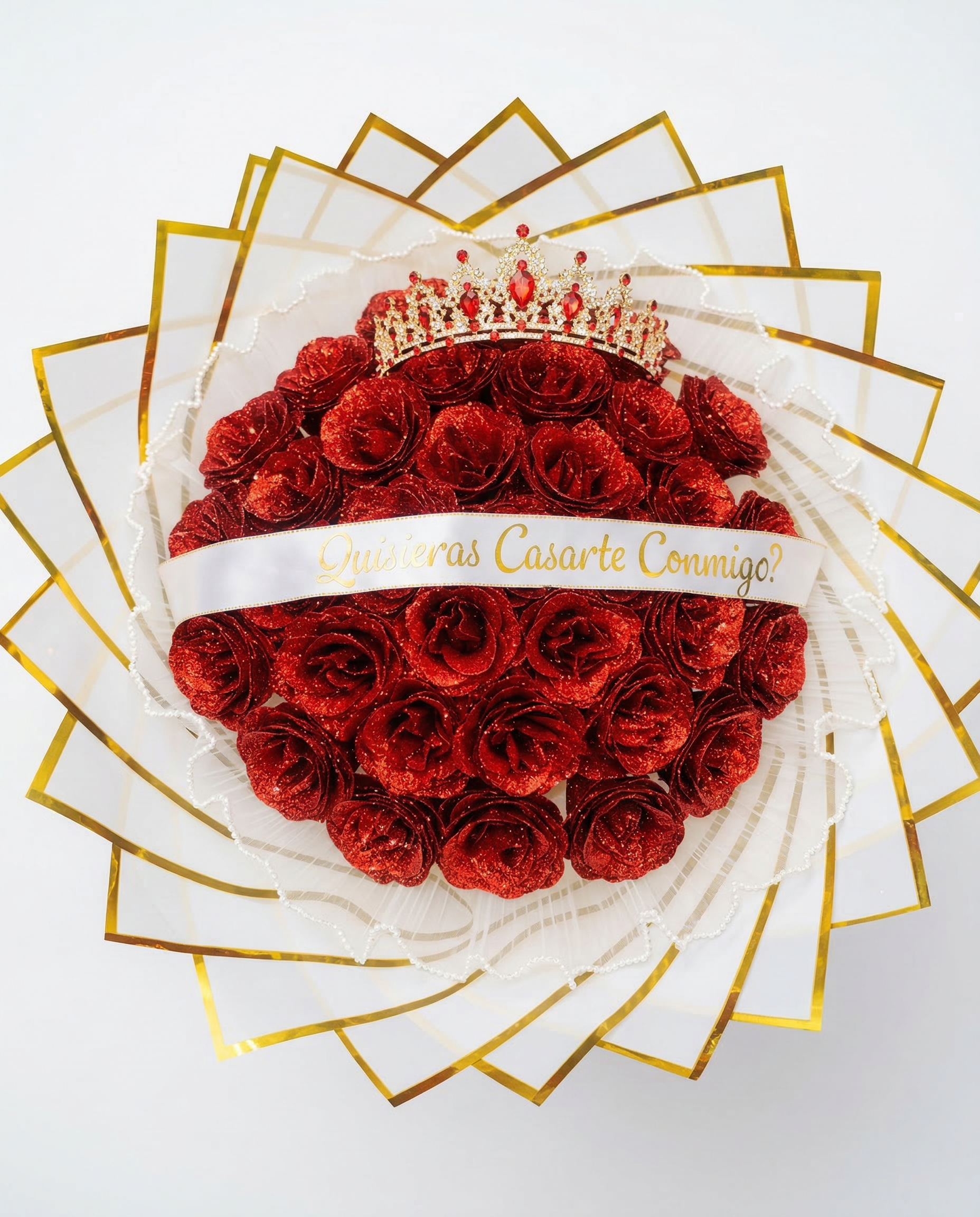 El núcleo del bouquet presenta un denso jardín circular compuesto por cientos de rosas eternas de espuma de alta calidad, seleccionadas a mano. En lugar del mate tradicional, cada rosa posee un acabado deslumbrante de purpurina roja intensa, creando un mar de destellos que impacta a primera vista. Un borde de tul blanco perlado tipo encaje añade un toque de delicadeza nupcial.