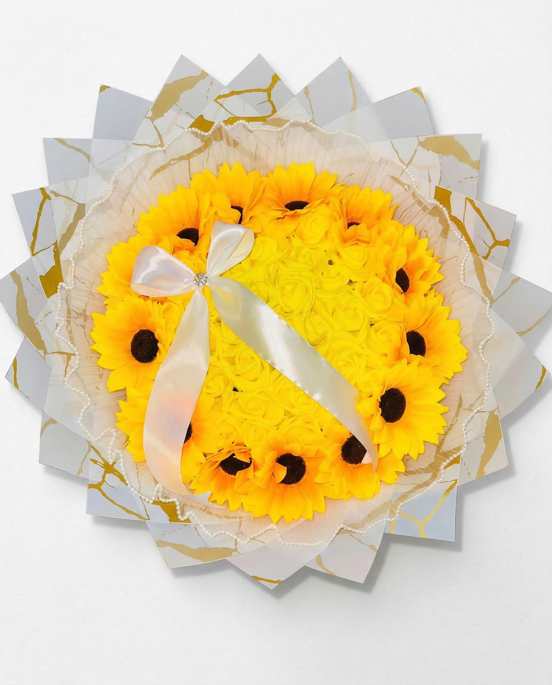 Ilumina cualquier espacio y corazón con el vibrante y elegante Bouquet Golden Marble Sunflower. Este diseño artesanal es una celebración del sol, combinando la alegría rústica de los girasoles con la sofisticación moderna del mármol.