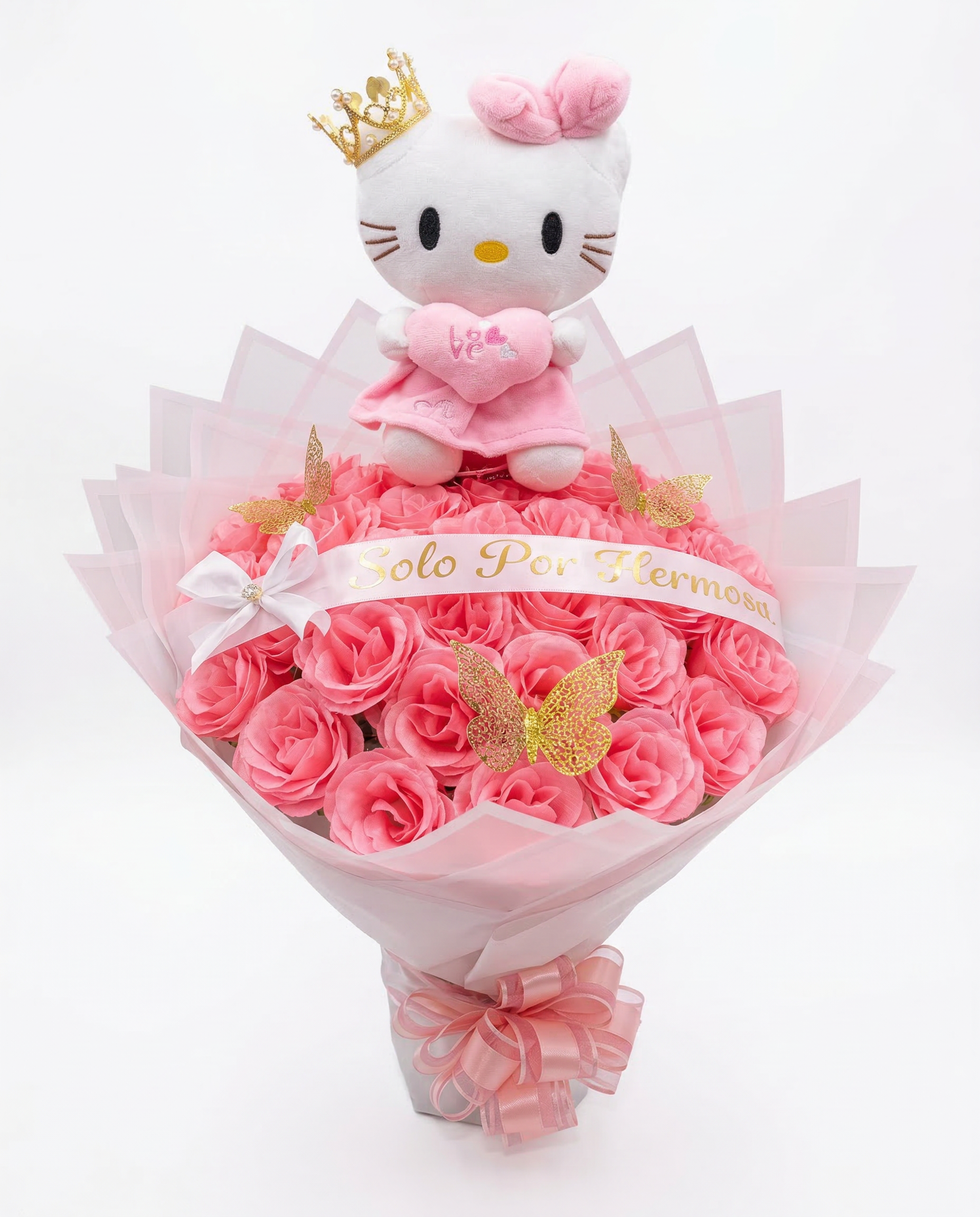 Sorprende con la ternura inigualable de nuestro Bouquet Hello Kitty Real Love. Este diseño está creado para derretir corazones, combinando la dulzura del personaje más querido con la elegancia de las flores eternas.