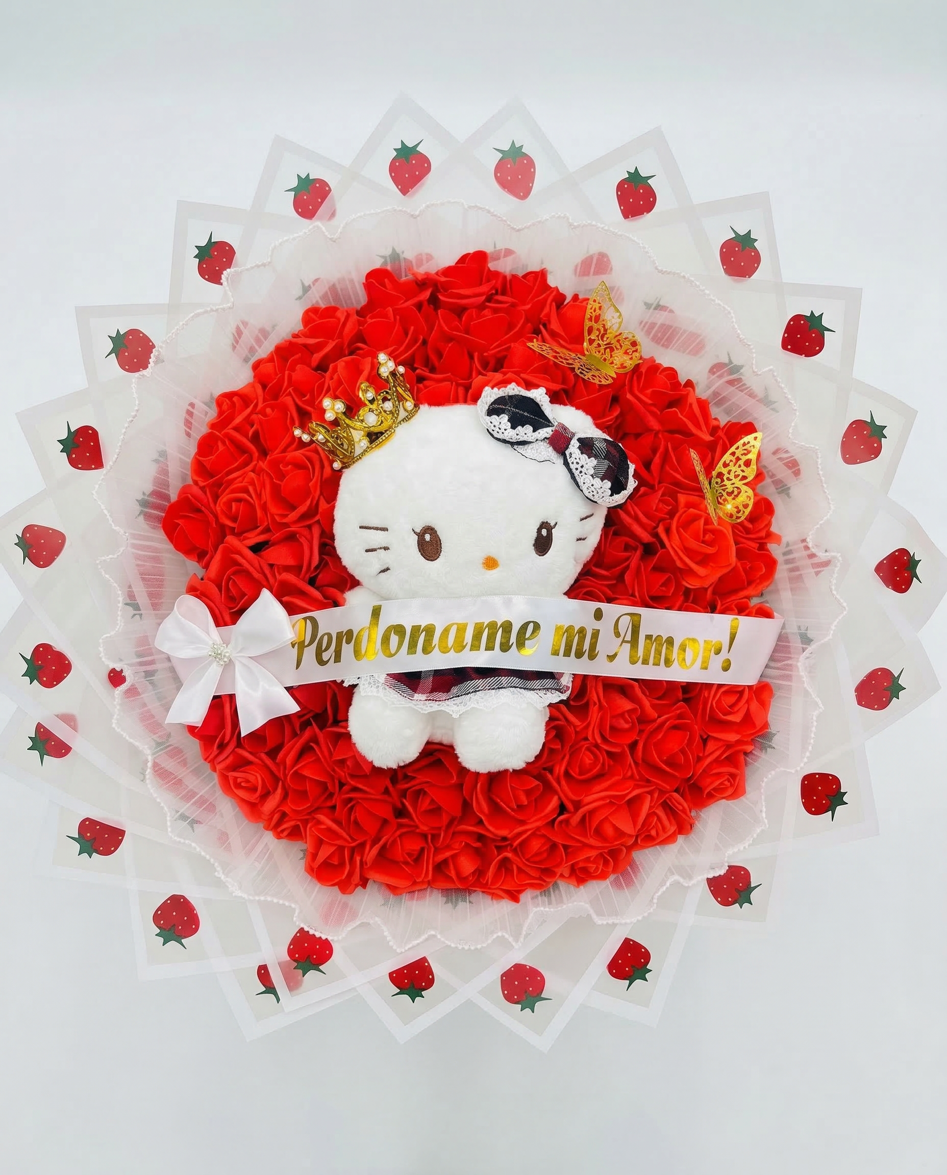 Pide disculpas de la manera más dulce y conmovedora con nuestro Bouquet Hello Kitty Strawberry Pardon. Este diseño artesanal combina la ternura inigualable de Hello Kitty con la pasión de las rosas rojas, creando un regalo sincero y adorable diseñado para ablandar corazones.