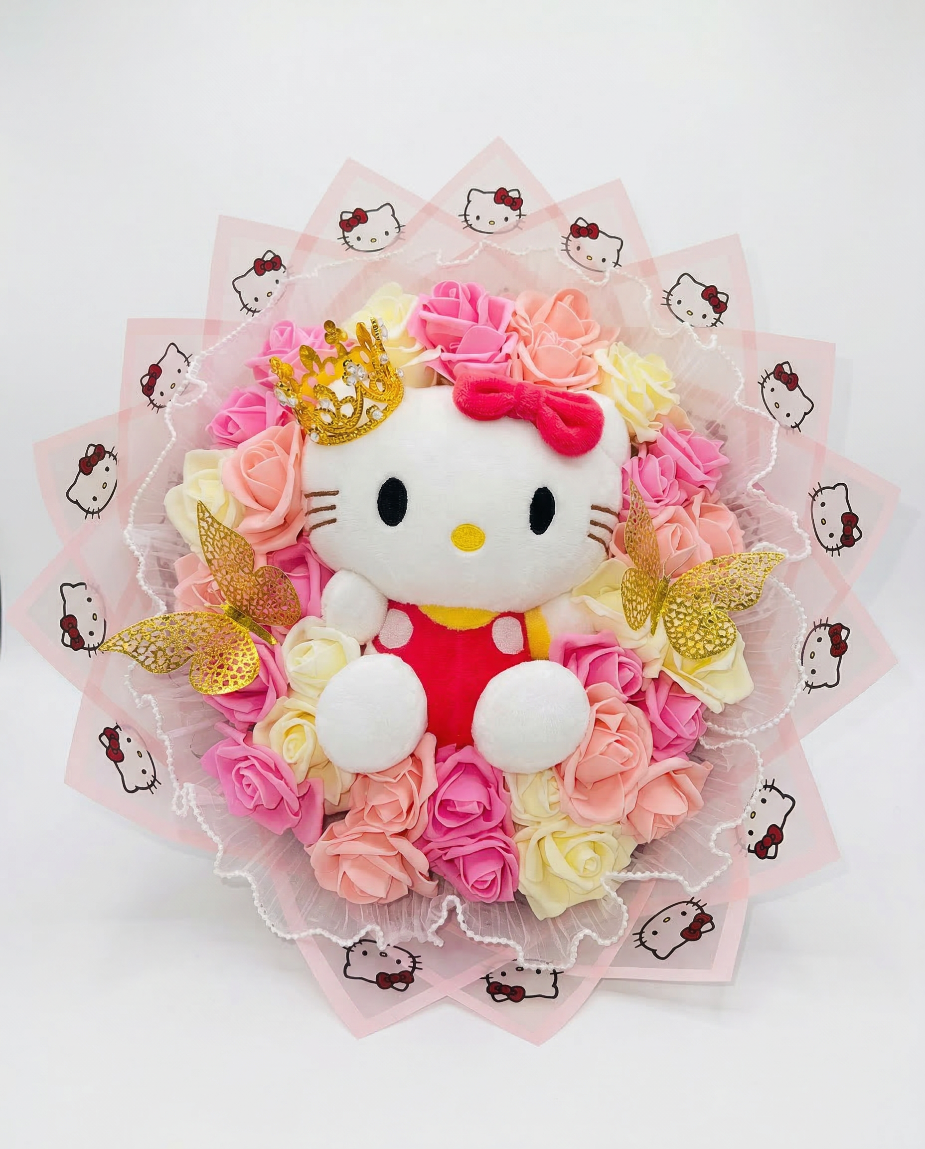 Embárcate en un cuento de hadas con nuestro Bouquet Kawaii Hello Kitty Princess. Este diseño artesanal es la máxima expresión de ternura y dulzura, creado para cautivar a los amantes de la icónica gatita con un toque de elegancia real.