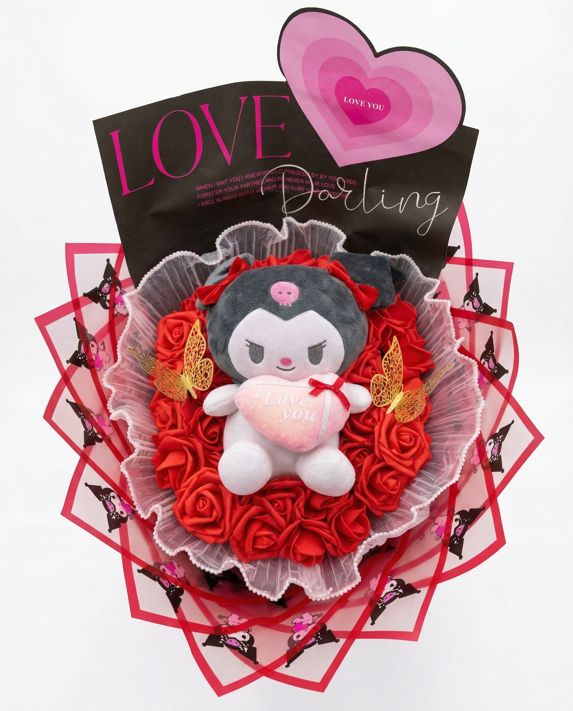 El núcleo del bouquet presenta un deslumbrante jardín circular compuesto por cientos de rosas eternas de espuma de alta calidad, seleccionadas a mano. La paleta de colores presenta un intenso rojo pasión, creando un contraste visual sofisticado y pasional que resalta la figura de Kuromi.