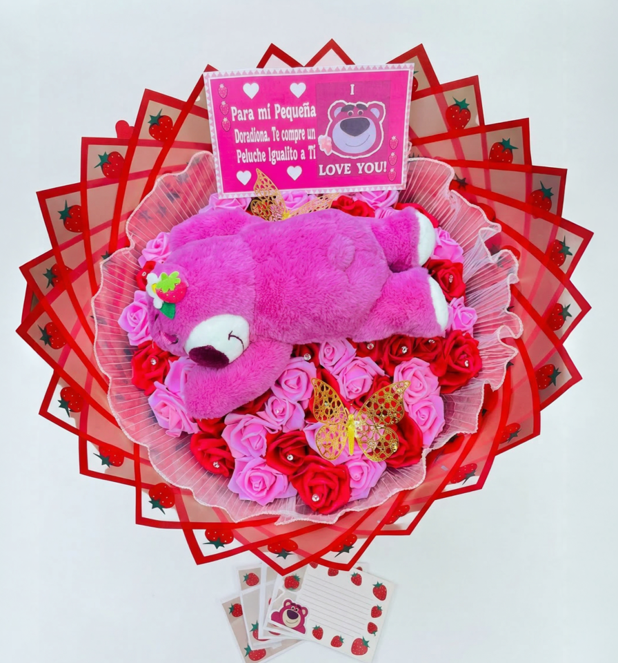 Sorpréndela con este increíble arreglo que combina un tierno peluche de Lotso recostado sobre un colchón de rosas eternas en fucsia y rojo. Envuelto en papel con estampado de corazones y decorado con espectaculares mariposas doradas de filigrana y un mensaje personalizado que dice: “Para mi Pequeña Dormilona, Te compre un Peluche Igualito a Ti!”. Un regalo eterno, lujoso y lleno de suavidad que nunca olvidará.