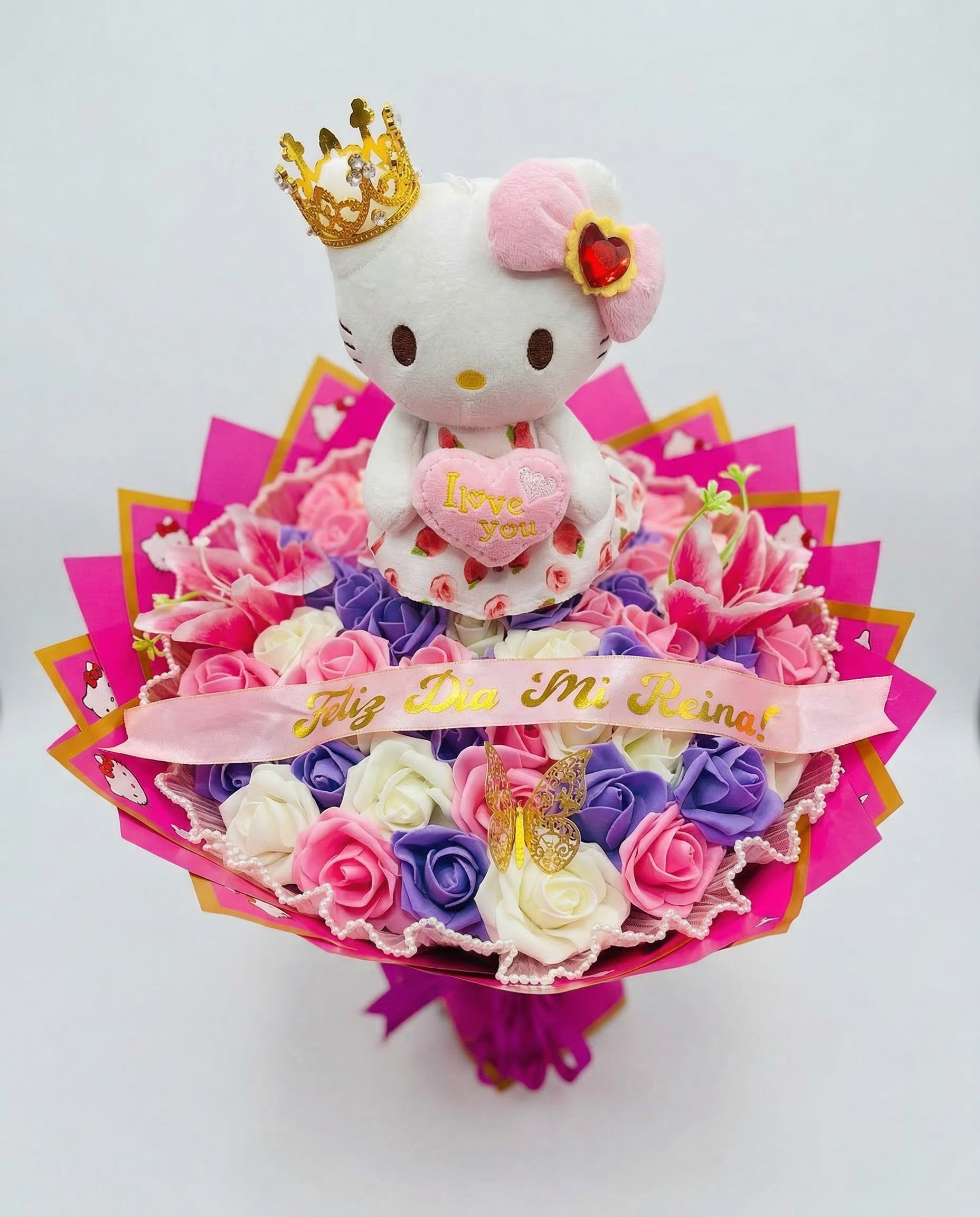 En el corazón del arreglo descansa un adorable peluche premium de Hello Kitty, vestida en un traje floral de temporada y sosteniendo un tierno corazón rosa bordado con la frase “I Love You”. La iconográfica gatita luce una deslumbrante tiara de oro de filigrana, convirtiéndola en una verdadera reina de corazones. Su felpa es increíblemente suave, invitando a la caricia.