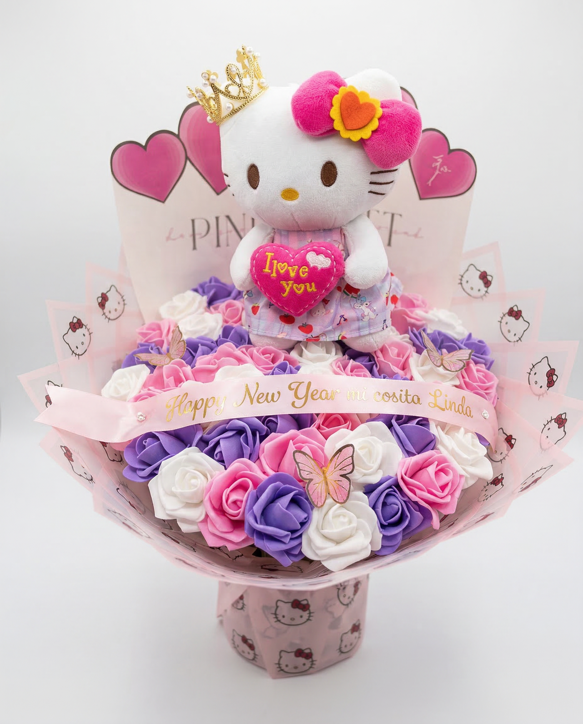 ¡Haz que se sienta como la verdadera reina de la fiesta! Este espectacular bouquet combina un denso jardín de rosas eternas tricolor (púrpura, rosa y blanco) con un adorable peluche de Hello Kitty luciendo una tiara de perlas. Envuelto en capas de papel estilo boutique de diseñador con monogramas dorados y una banda de satén personalizada con caligrafía dorada (“Happy New Year mi cosita Linda”). Un detalle eterno, imponente y lleno de personalidad que nunca olvidará. ¡Inolvidable!