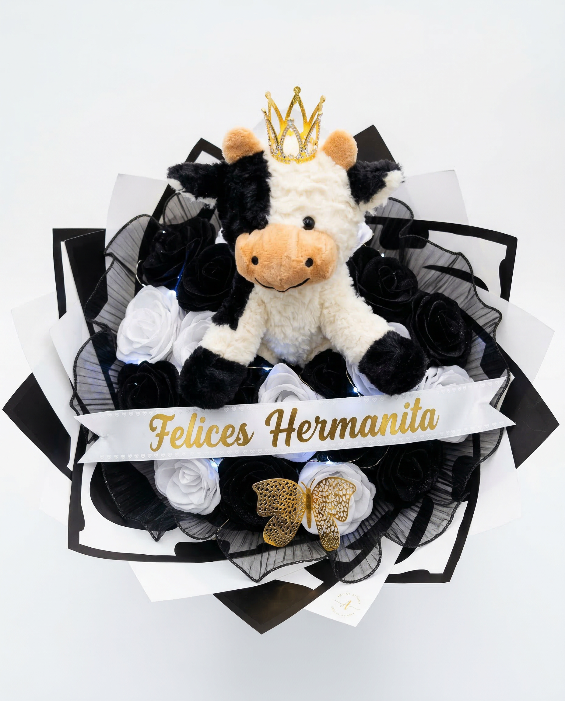 Celebra una ocasión especial con el toque más tierno y original. El Bouquet Royal Cow es un diseño único que combina la sofisticación del contraste blanco y negro con la dulzura de un tierno personaje.