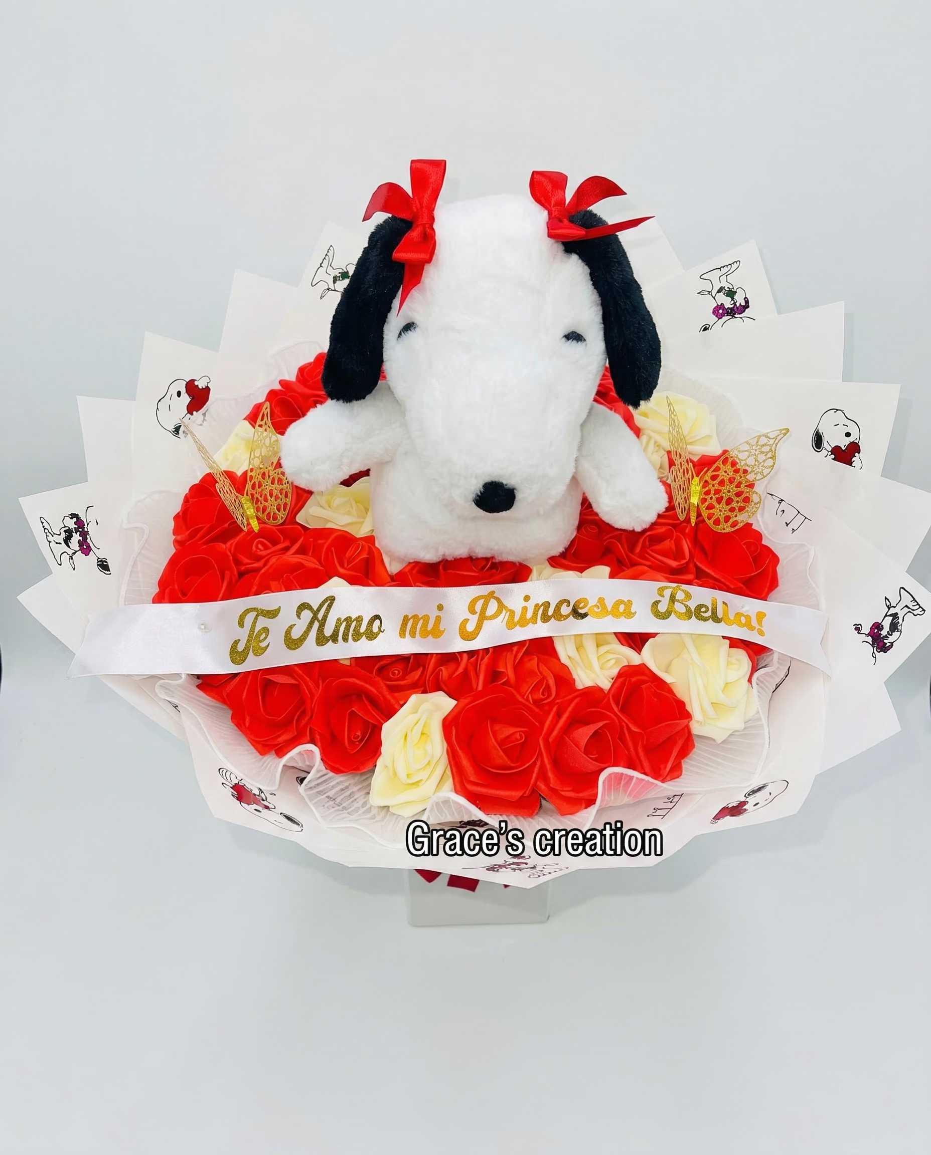 Eleva el romance al siguiente nivel con el Bouquet Snoopy Amor Ternura. Este impresionante arreglo radial ha sido diseñado meticulosamente para un momento único en la vida. Combinando la intensidad del rojo carmesí con el lujo del blanco crema y el encanto atemporal de Snoopy, este bouquet no es solo un regalo, es una declaración majestuosa que captura la esencia de un amor puro y una ternura inigualable.