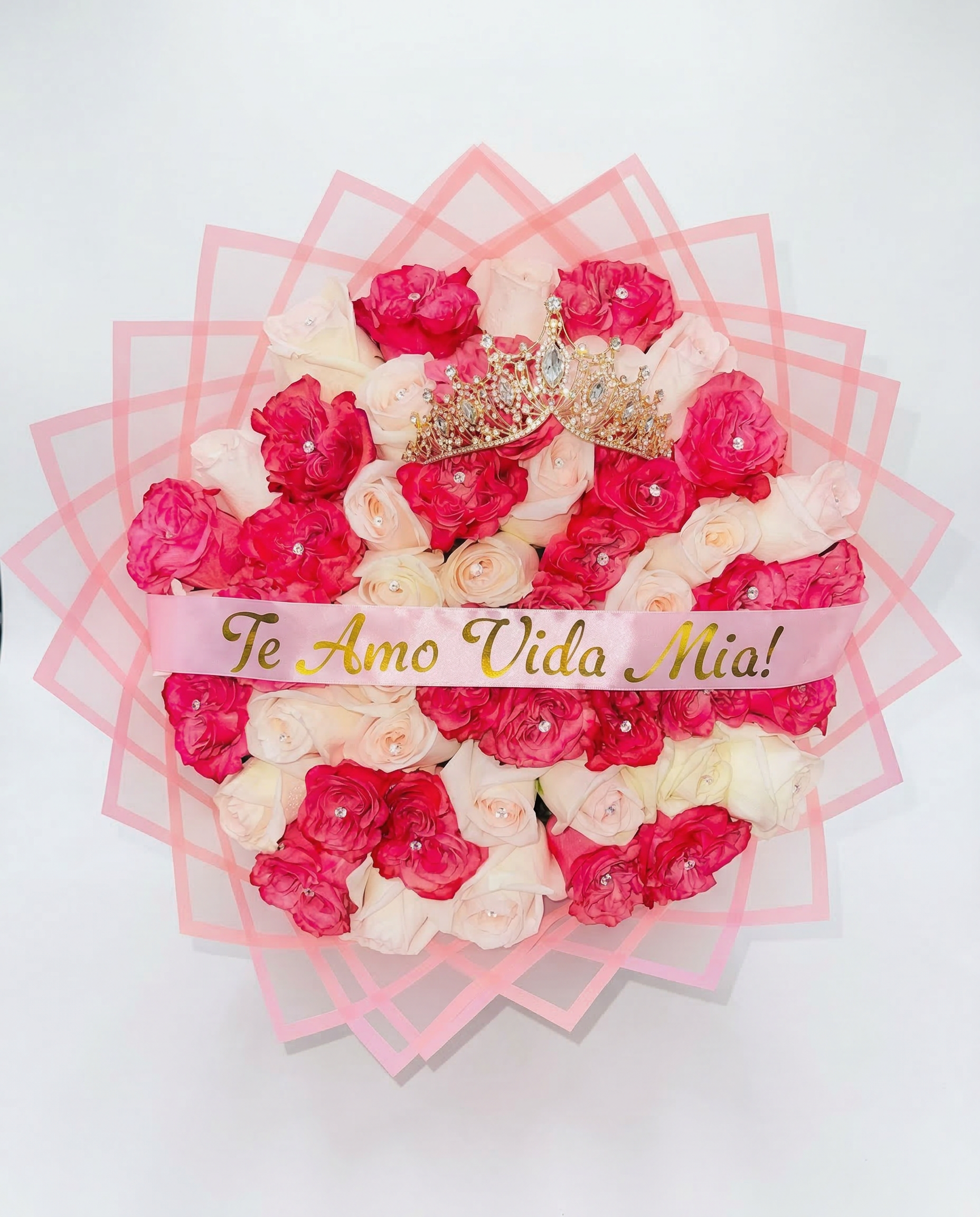 Banda de Satén Personalizada: Incluye una elegante cinta rosa con letras doradas en relieve que dice: “Te Amo Vida Mia!”, un mensaje clásico que nunca pasa de moda.