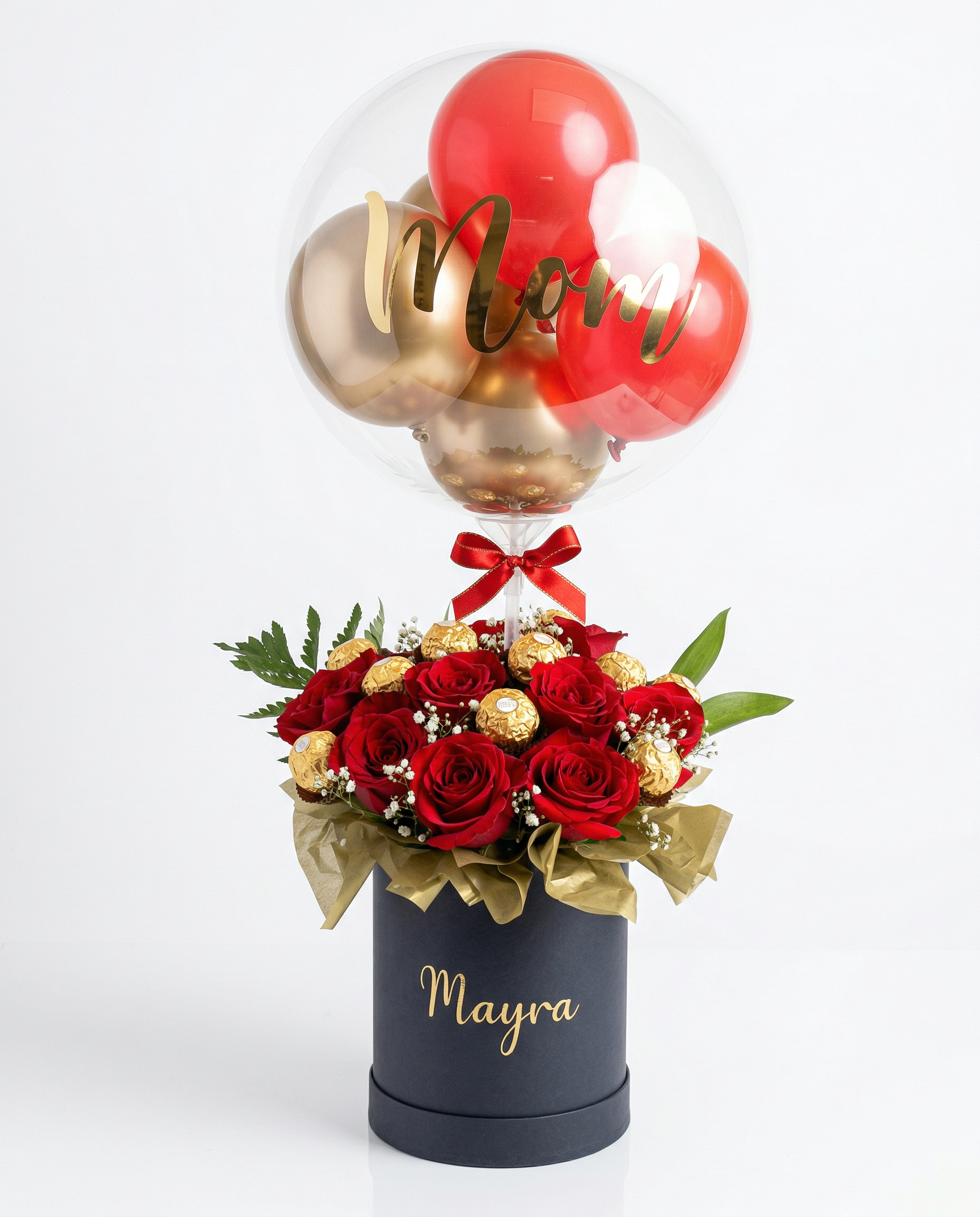 Elemento Sorpresa: El arreglo es coronado por un impresionante globo burbuja transparente de gran formato, que en su interior resguarda globos satinados en tonos rojo y dorado. El globo lleva la inscripción “Mom” en vinil dorado de alta calidad.