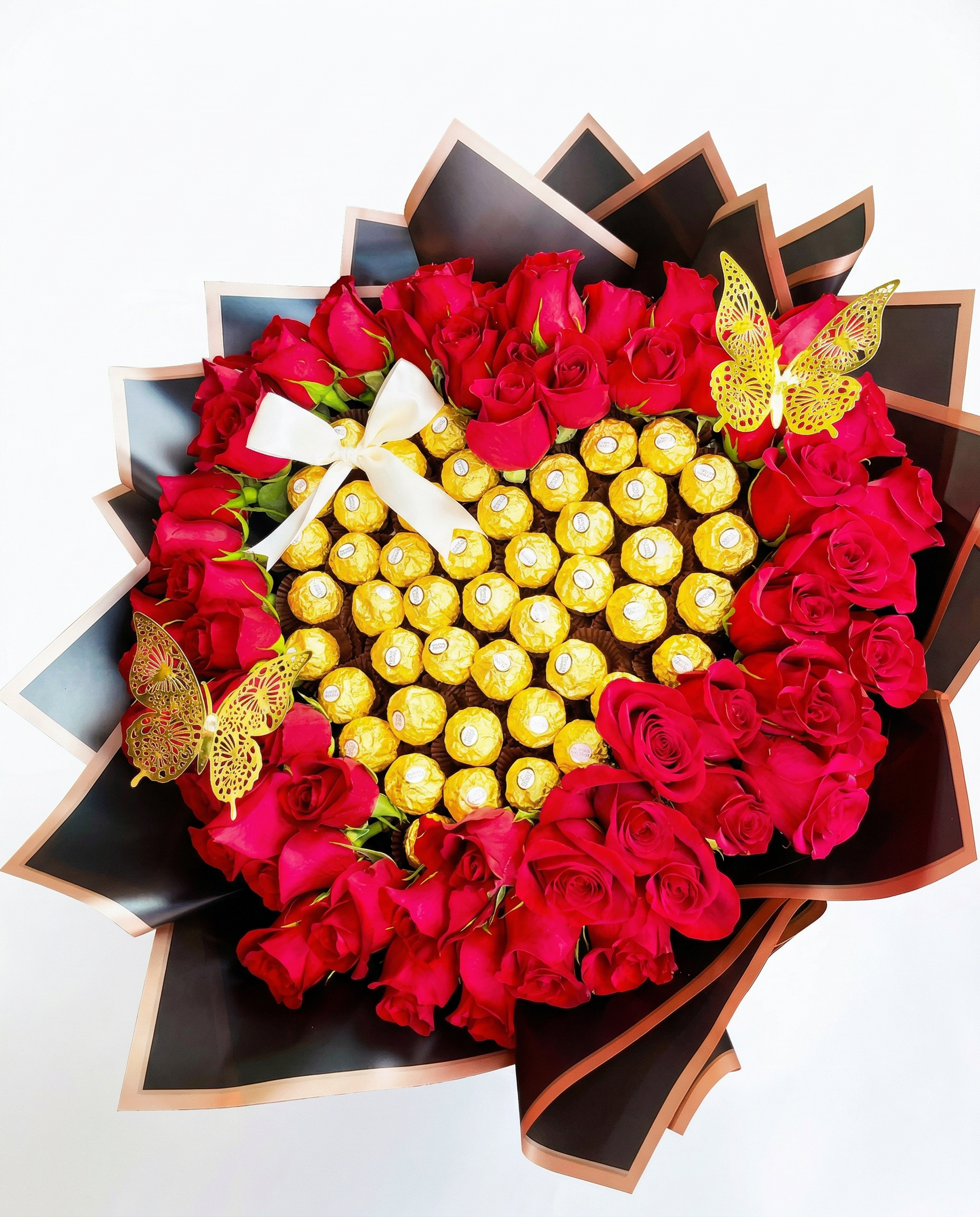 El arreglo “Noche de Gala” ha sido diseñado para momentos donde las palabras no son suficientes. Este bouquet fusiona la textura rica de las rosas premium con el brillo icónico de los Ferrero Rocher, creando un impacto visual dramático y sofisticado que simboliza un amor valioso, profundo y dulce.