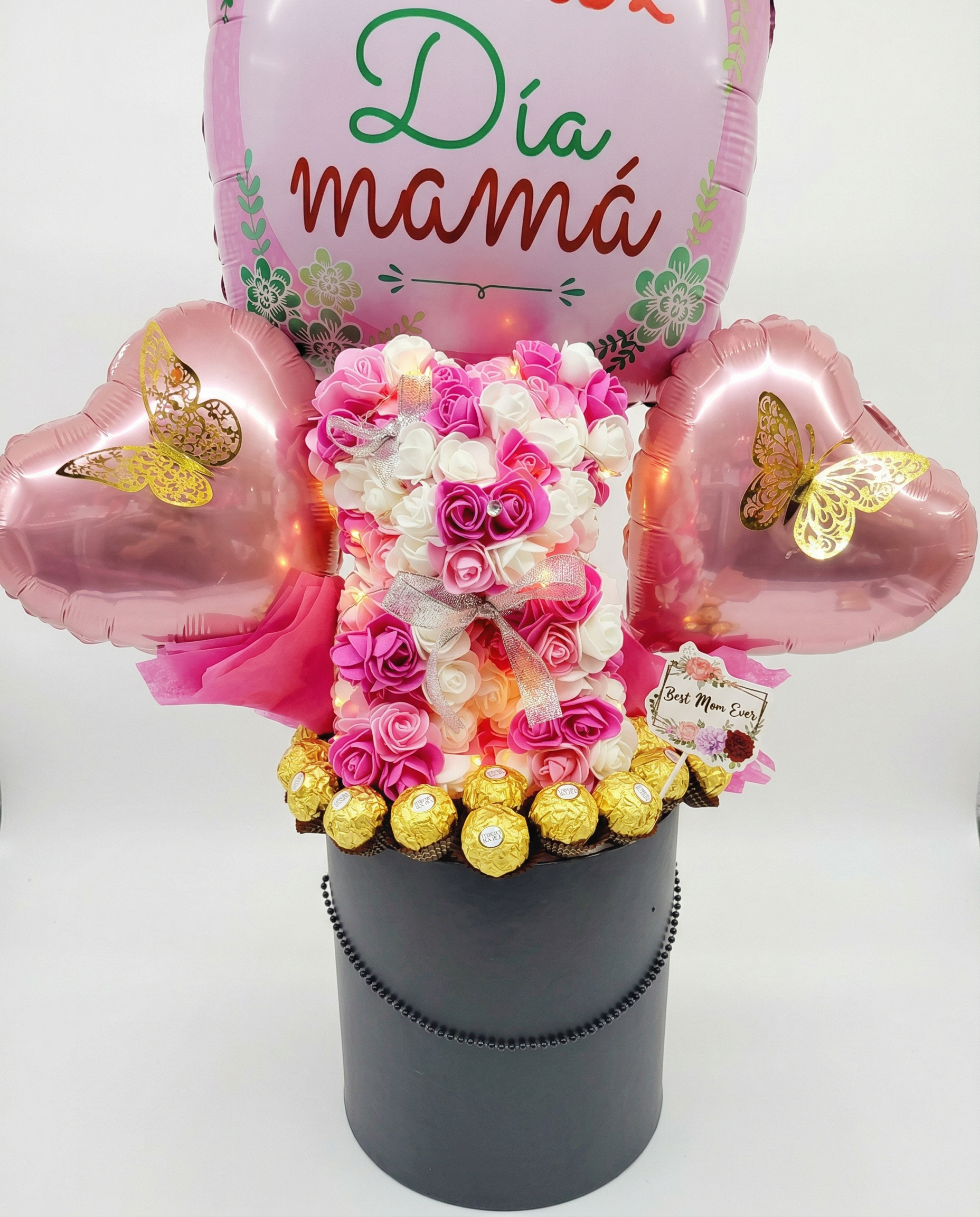 Set de Globos Premium: Incluye un globo principal con el mensaje “Feliz Día Mamá” y dos globos laterales en forma de corazón rosado, adornados con mariposas doradas que parecen volar sobre el arreglo.