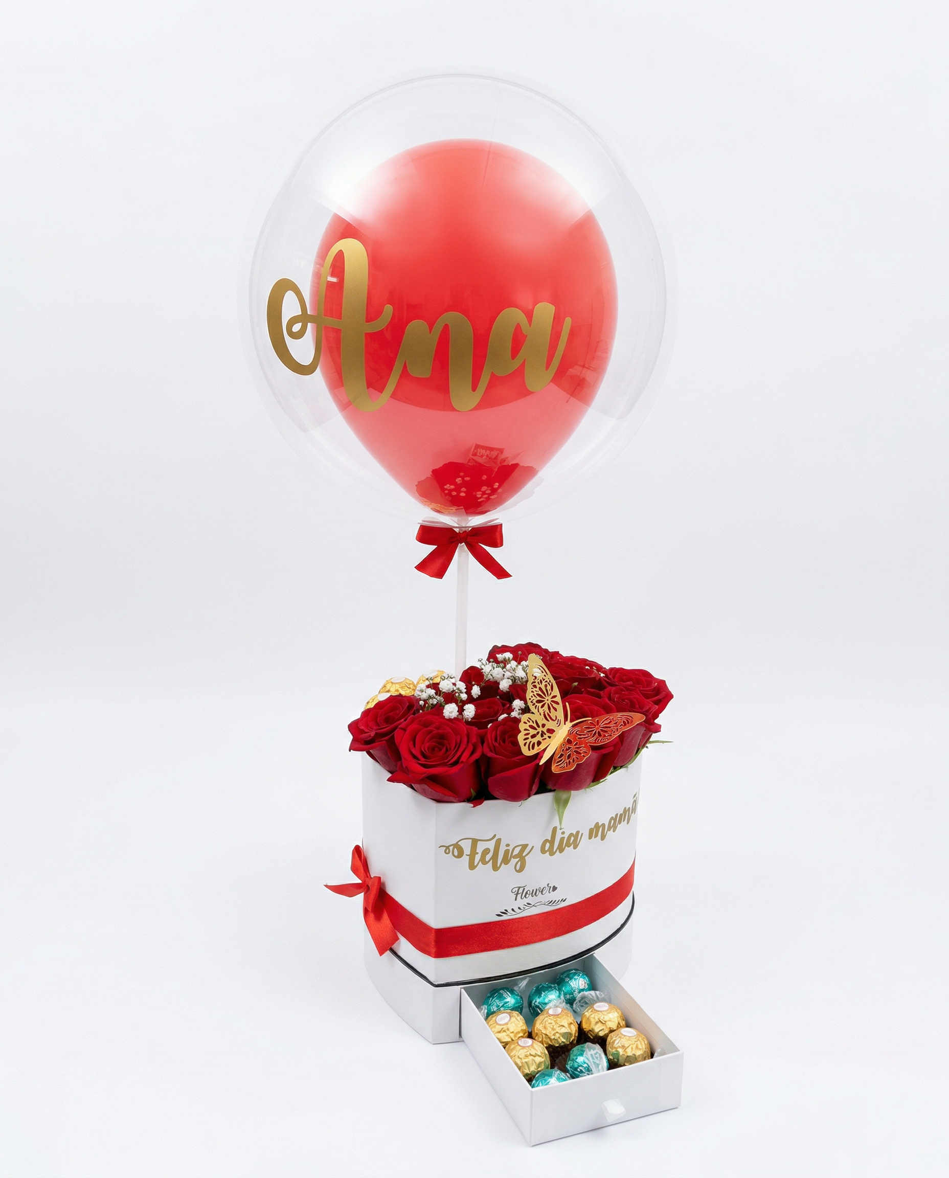 El regalo definitivo para la reina del hogar. Nuestra Luxury MOM Box rinde homenaje a mamá con un diseño arquitectónico que deletrea su título más importante con bombones Ferrero Rocher y un corazón central de rosas rojas con cristales. Una pieza de exhibición que combina arte floral y alta chocolatería.