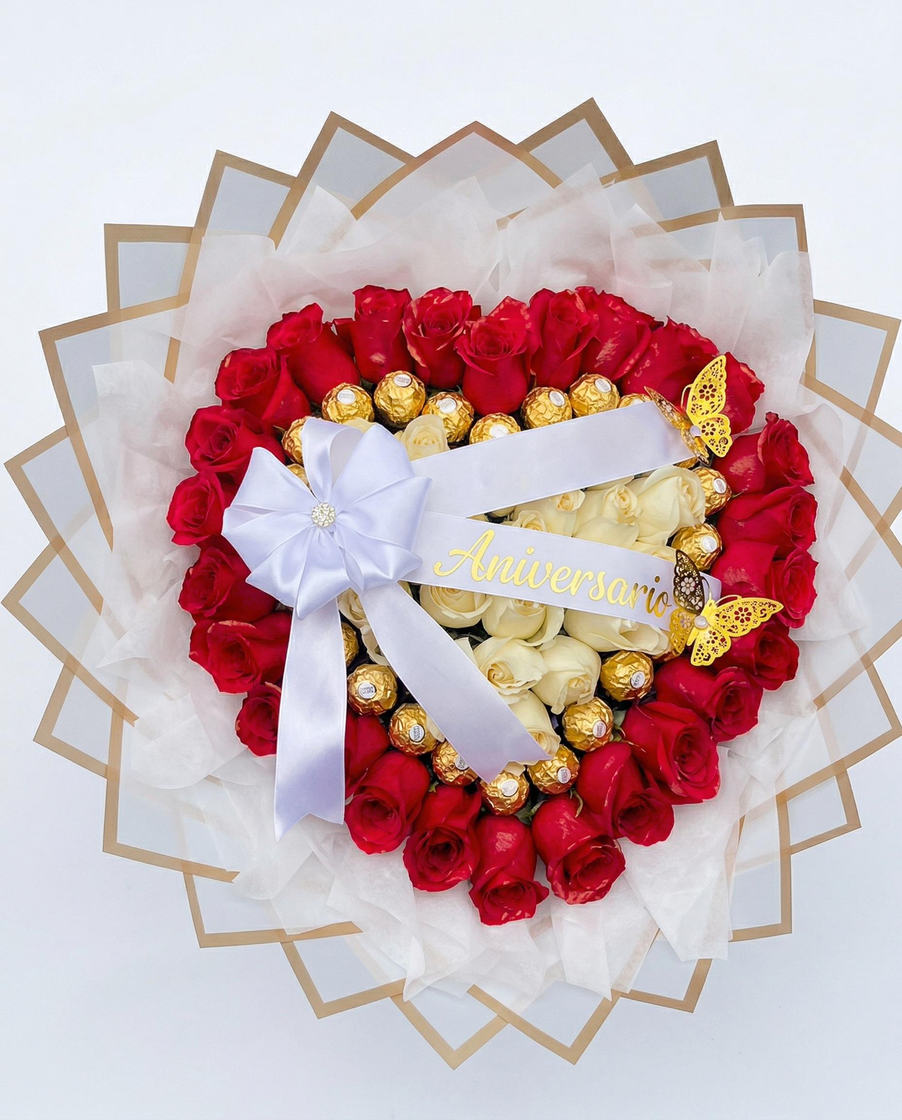 Borde de Oro: Una fila de bombones Ferrero Rocher delinea la unión entre ambos colores de rosas, añadiendo una textura exquisita y un brillo dorado.