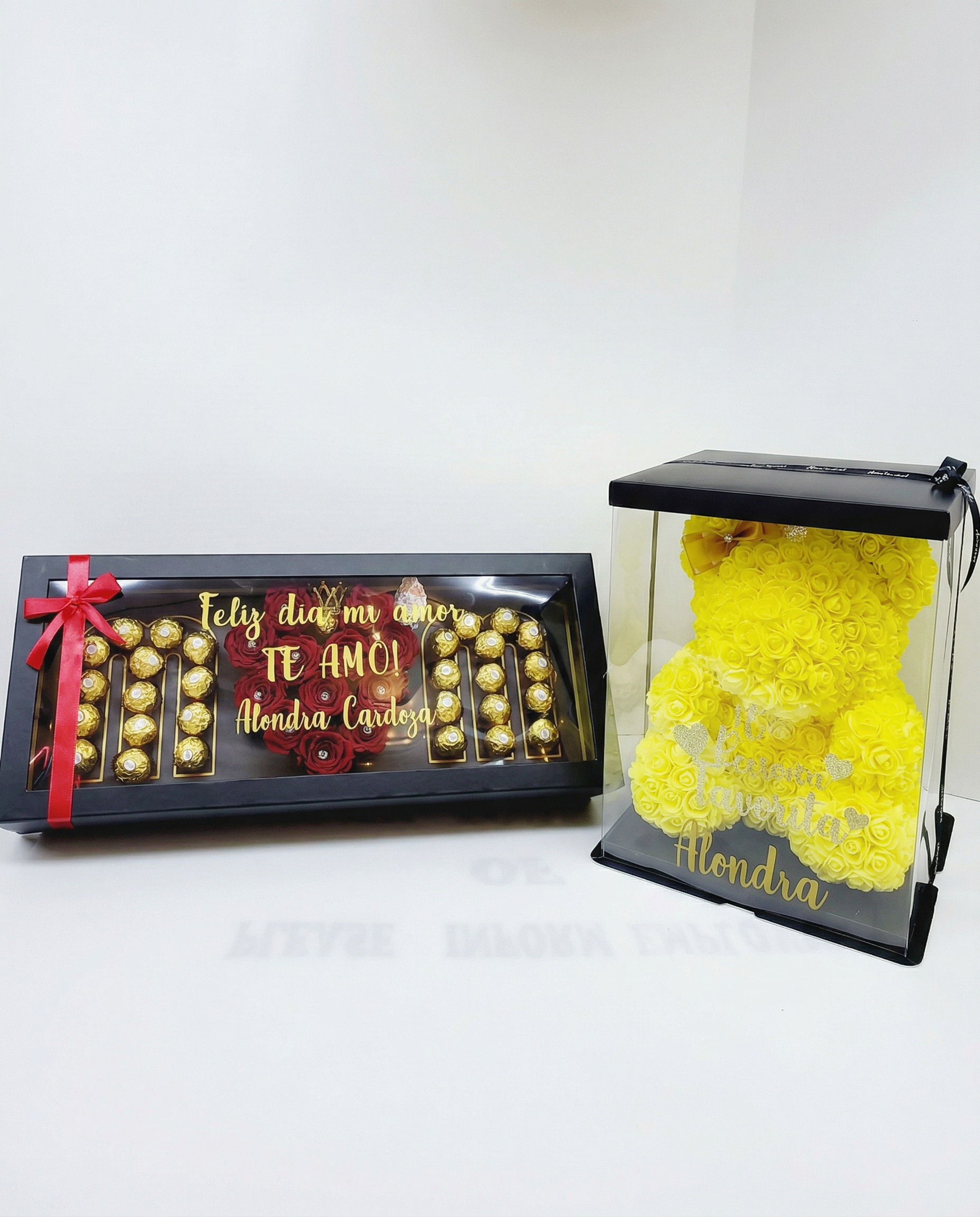 Diseño en Chocolates: A los costados del corazón floral, se encuentran bombones Ferrero Rocher dispuestos de forma simétrica. El conjunto se completa con una mariposa dorada troquelada que añade un toque de magia y movimiento.