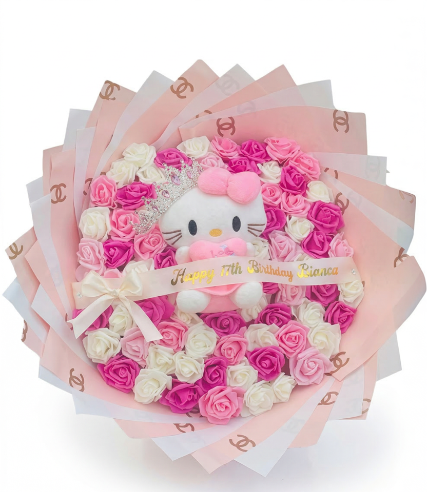 ¡Haz que se sienta como la verdadera reina de la fiesta! Este espectacular bouquet combina un denso jardín de rosas eternas tricolor (fucsia, rosa y blanco) con un adorable peluche de Hello Kitty que luce una tiara de cristales. Envuelto en capas de papel estilo boutique de diseñador con monogramas dorados y una banda de satén personalizada que dice: “Happy 17th Birthday Bianca”. Un detalle eterno, imponente y lleno de elegancia que nunca olvidará. ¡Inolvidable!