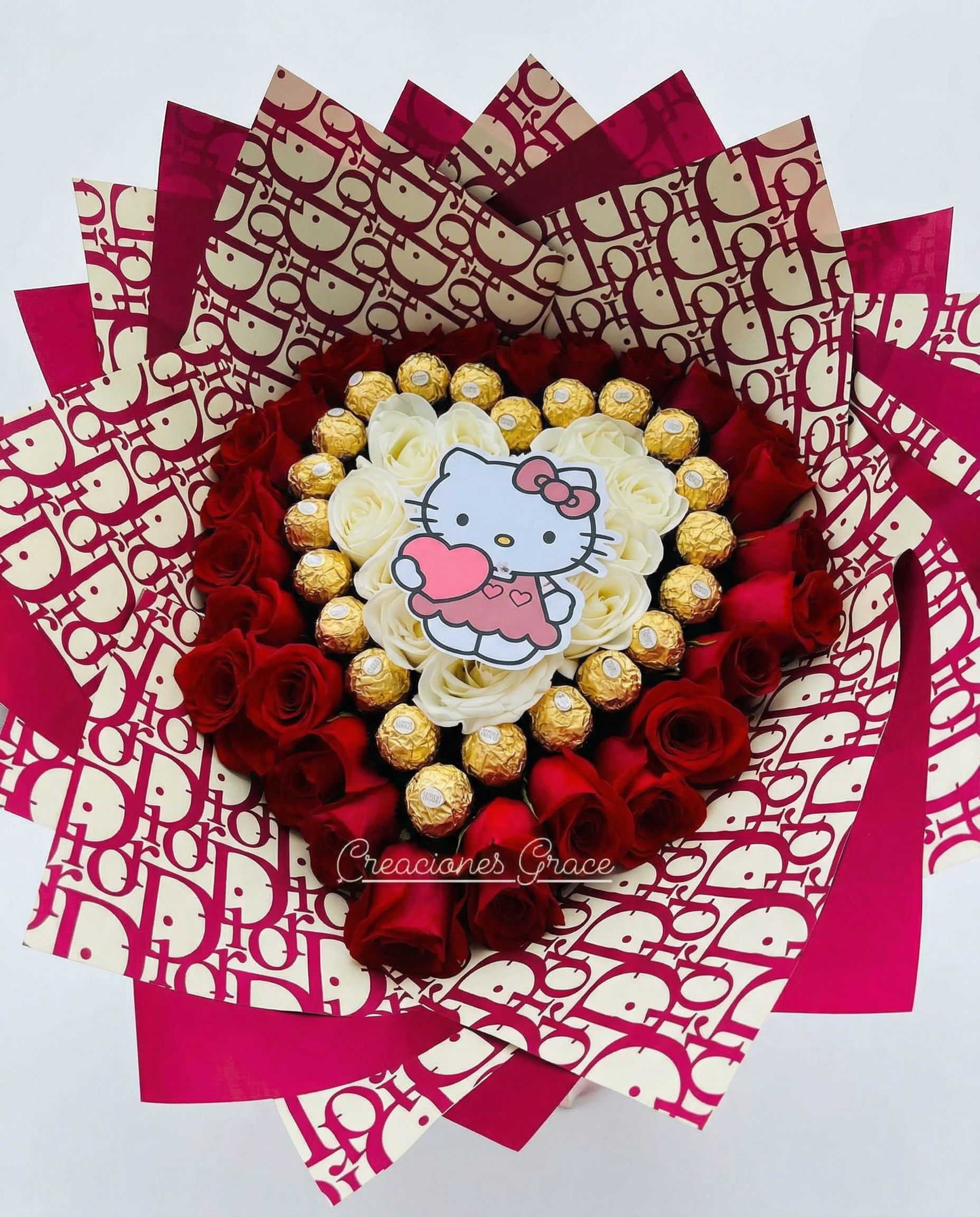 Dulzura y estilo en cada pétalo. El Hello Kitty Eternal Heart es un bouquet de gran formato que rinde homenaje a la ternura con un corazón central de rosas blancas y un marco de rosas rojas apasionadas. Decorado con bombones Ferrero Rocher y envuelto en papel de diseño inspirado en alta costura, es el regalo perfecto para fans de Kitty que aman el lujo.