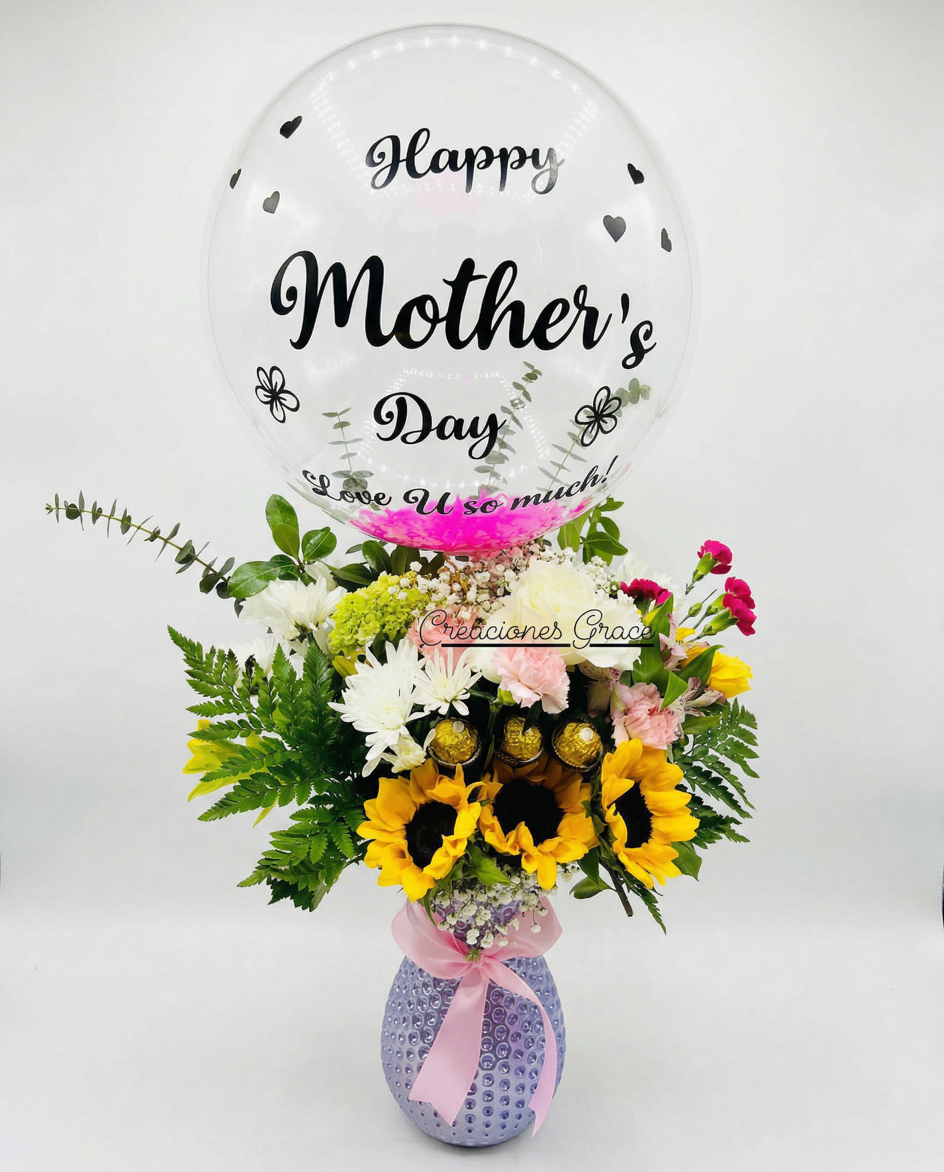 Este diseño es una composición festiva y alegre que combina flores vibrantes con un elemento flotante, ideal para crear un impacto visual inmediato. Es un arreglo dinámico que llena cualquier espacio de color y celebración.