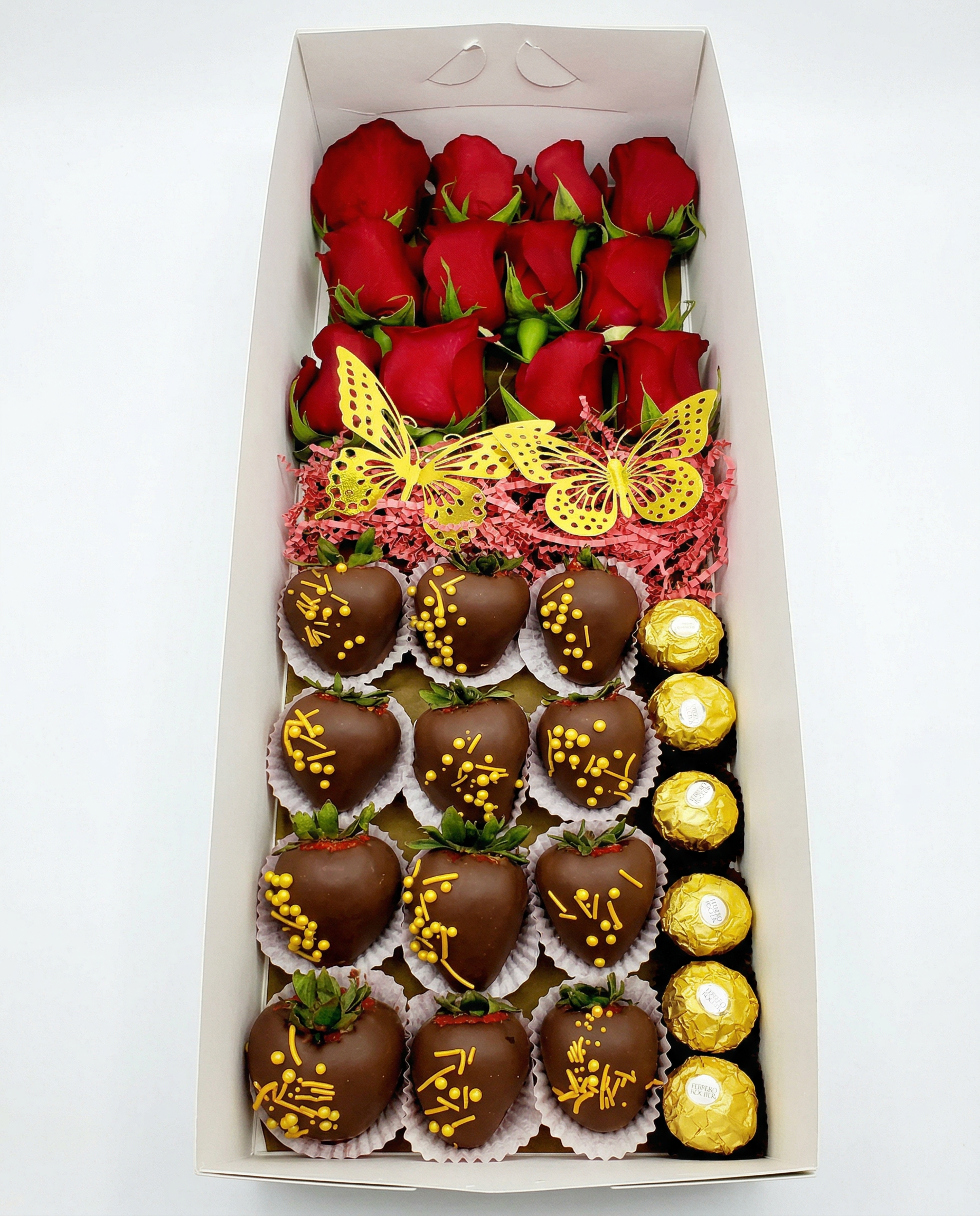 • Detalles de Mariposa: Decorado con mariposas doradas troqueladas que parecen sobrevolar los chocolates, añadiendo un toque de delicadeza y simbolismo.