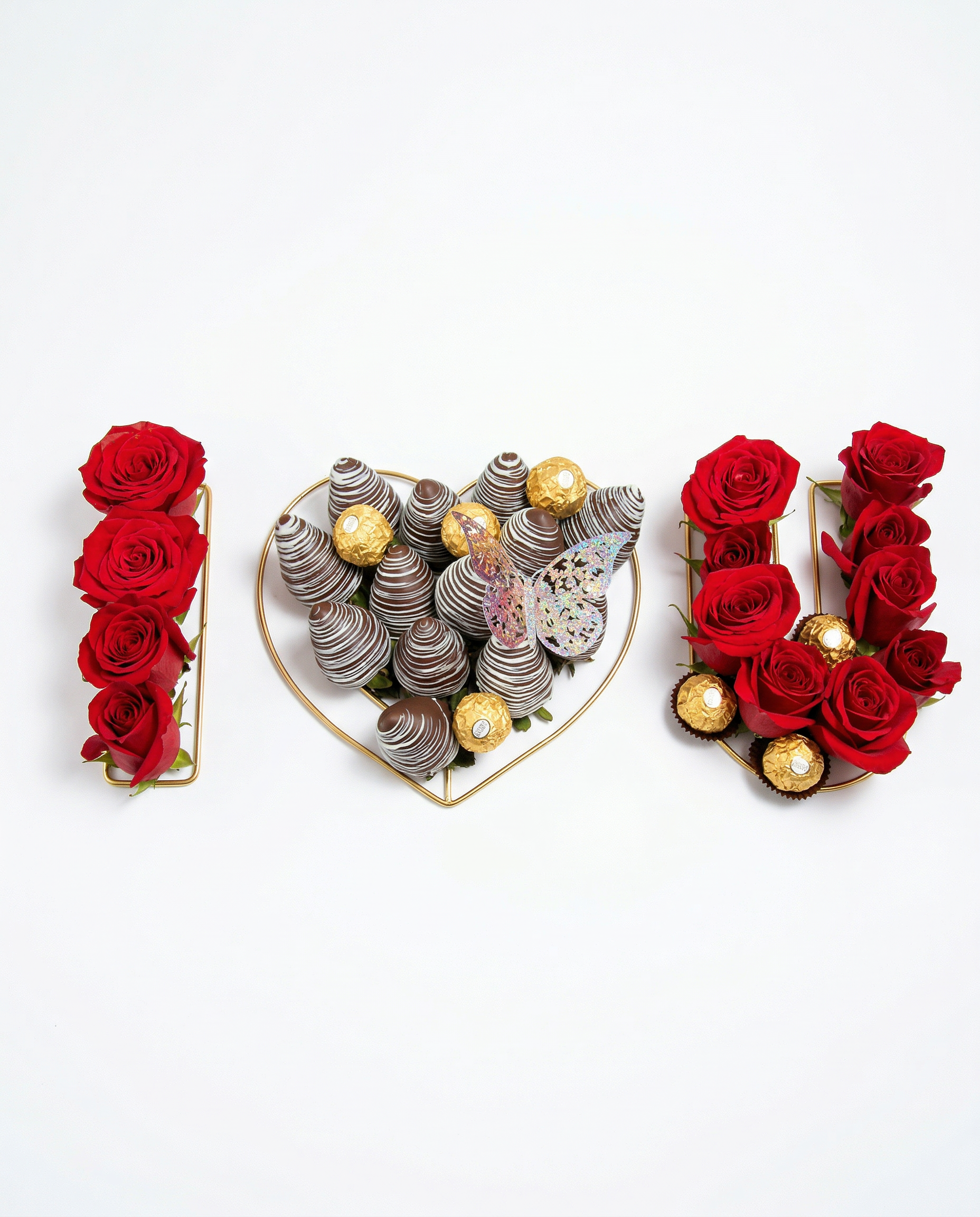 • Trilogía de Sabores: Incluye 12 fresas de gran tamaño cubiertas con chocolate de leche y decoradas con lluvia de oro comestible, junto a una columna de bombones Ferrero Rocher.