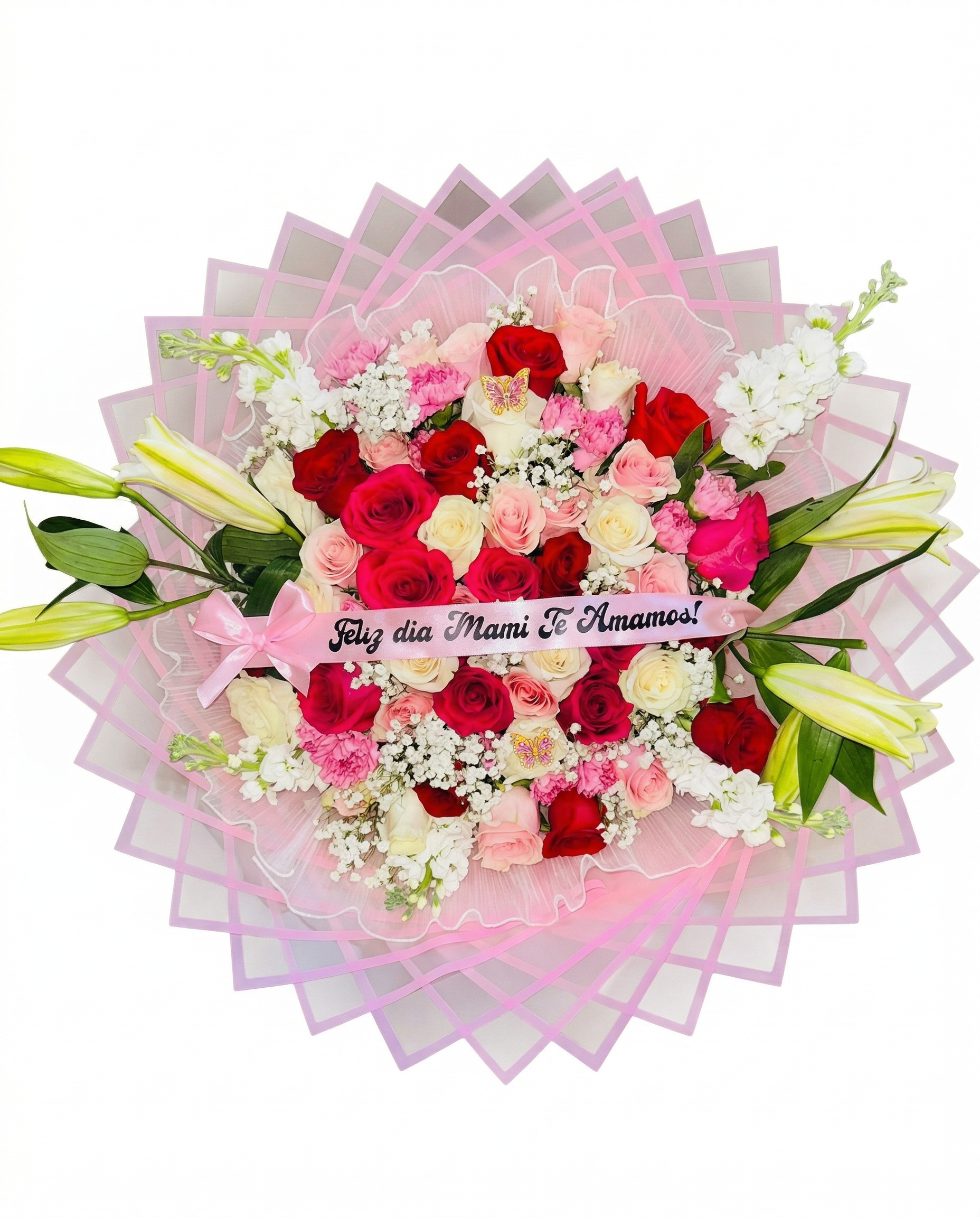 • Diseñado para celebraciones monumentales, este arreglo presenta un domo central de rosas rojas rodeado por una corona radiante de girasoles premium. El envoltorio estructural en negro mate resalta el brillo de la joyería incluida y la banda dorada de “Happy Birthday!”.
