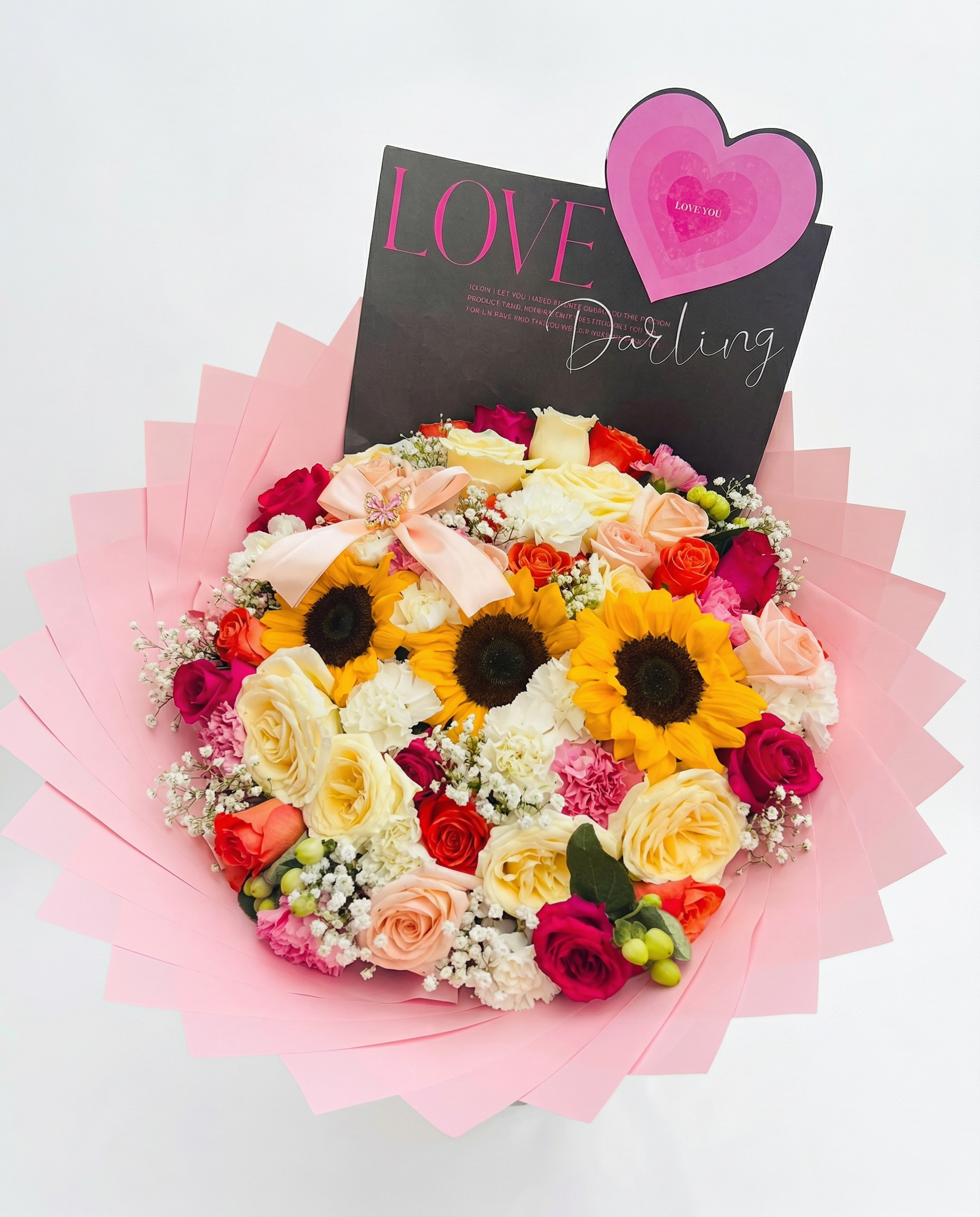 Este bouquet de gran formato es una pieza de diseño que combina texturas suaves con colores intensos. Diseñado bajo la estética de la floristería coreana contemporánea, cada elemento está dispuesto para crear un contraste visual inolvidable. Es una pieza que integra el mensaje directamente en el empaque, convirtiendo el regalo en una declaración de arte floral.