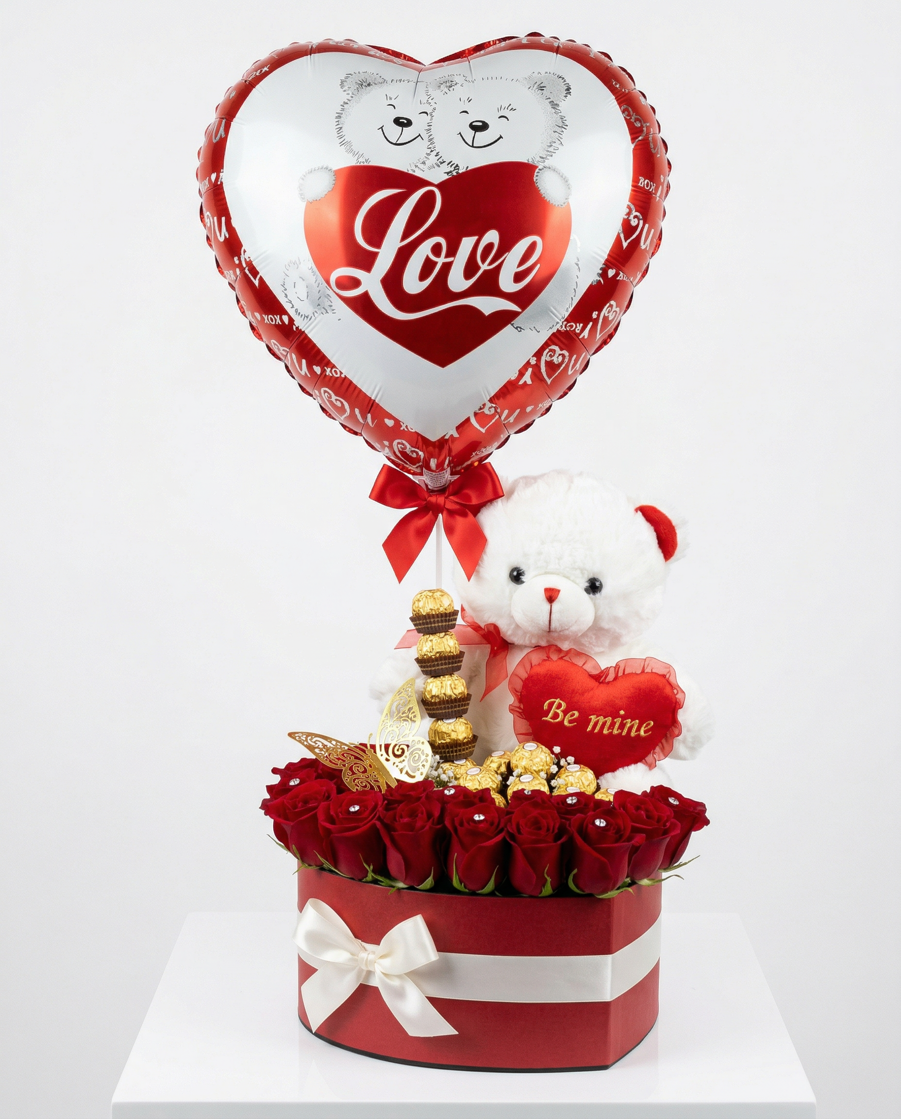 Compañía Tierna: Incluye un oso de peluche blanco de alta calidad que abraza un corazón rojo con la frase bordada “Be mine”.