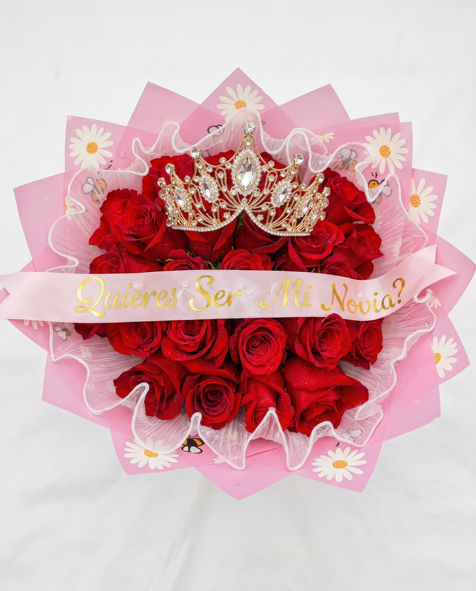 ¿Listo para dar el siguiente paso? El bouquet ‘Promesa de Cristal’ es la mezcla perfecta de ternura y lujo. Un corazón de rosas rojas premium custodiado por una majestuosa corona de cristales, envuelto en papel coreano de margaritas que evoca pureza y amor nuevo. Incluye la cinta personalizada: ¿Quieres ser mi Novia? para un momento mágico.