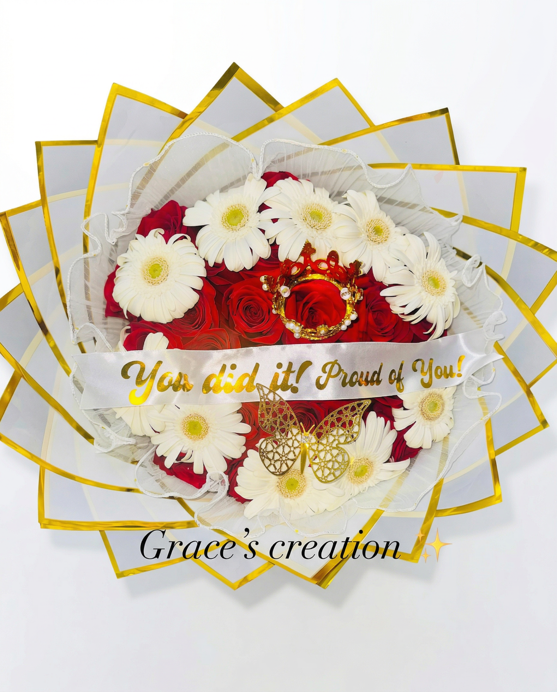 Detalles de Brillo: Incluye una mariposa de filigrana dorada y un listón de satén blanco con la frase “You did it! Proud of You!” impresa en foil dorado.