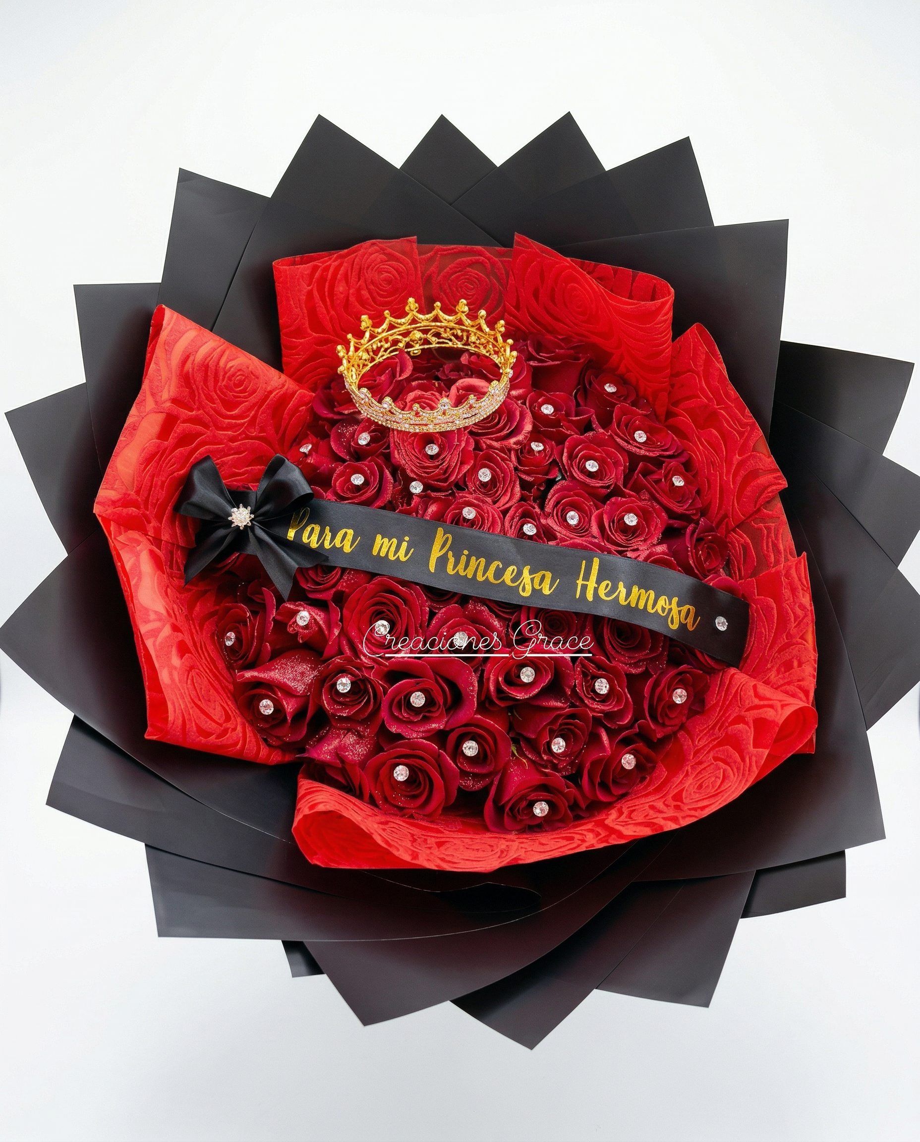 Impresionante ramo de rosas rojas con cristales incrustados y una espectacular tiara dorada. Su diseño boutique en negro mate y rojo texturizado, junto con un listón personalizado en oro, redefine la elegancia. Es el regalo definitivo para una declaración de amor o una celebración de gala, diseñado para quienes merecen un trato de realeza.