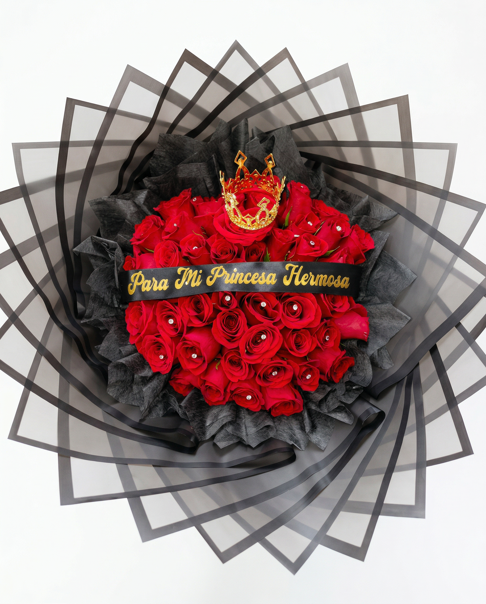 Impresionante ramo de gran formato con un domo de rosas rojas con cristales incrustados y una espectacular tiara dorada. Su diseño boutique en negro translúcido y negro texturizado, junto con un listón personalizado en oro, redefine la elegancia. Es el regalo definitivo para una declaración de amor o una celebración de gala, diseñado para quienes merecen un trato de realeza.