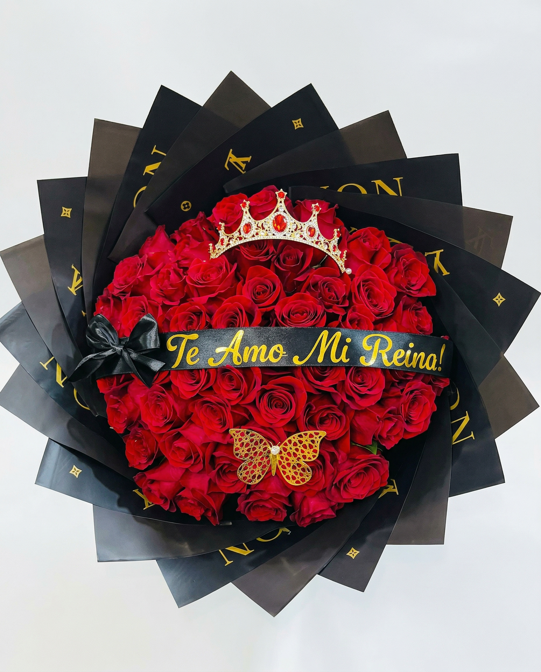 Impresionante ramo de rosas rojas premium de gran formato, destacado por su envoltorio de diseño con monograma negro y oro. Este modelo de gala se distingue por su corona real con cristales rojos, una mariposa de filigrana y un listón personalizado. Es la pieza definitiva para quienes buscan sorprender con un detalle que combina lujo, pasión y exclusividad total.
