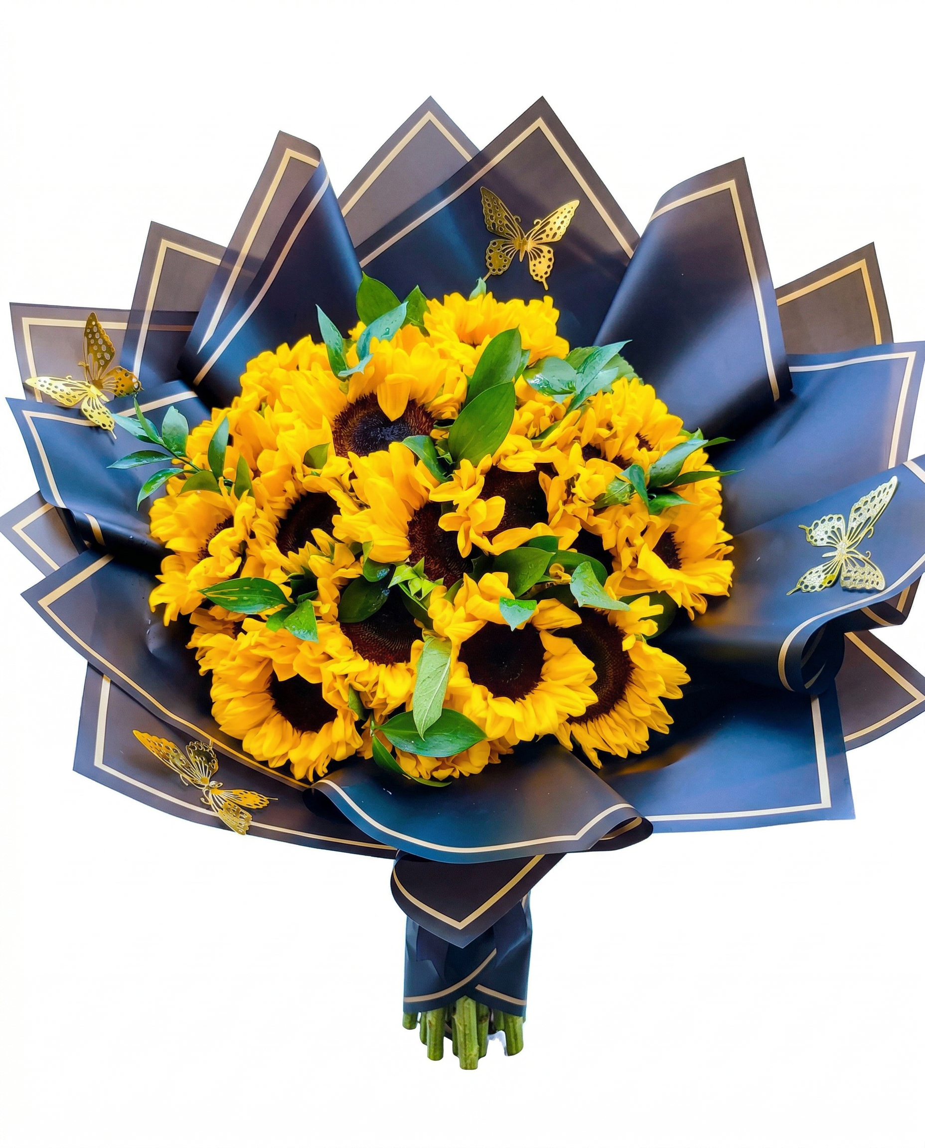 Ilumina el día de esa persona especial con nuestro exclusivo Ramo Sol de Media Noche. Este diseño rompe con lo tradicional al combinar la vitalidad rústica de los girasoles premium con una presentación de alta gama en tonos oscuros, creando un contraste visual que emana modernidad y alegría.