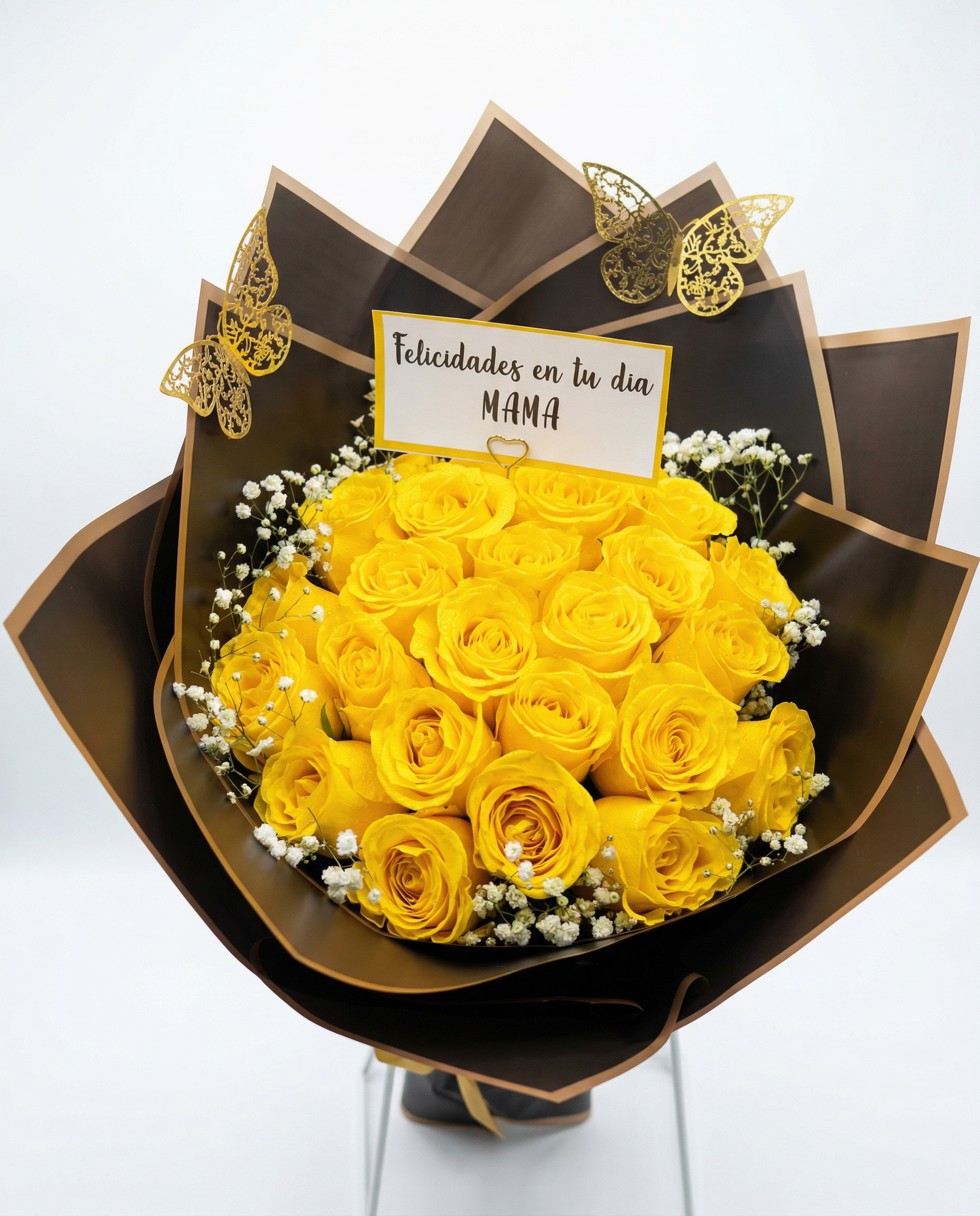 Celebra la alegría y el amor incondicional con nuestro exclusivo Ramo Luz de Mamá. Este diseño destaca por el vibrante brillo de sus rosas amarillas premium, un color que simboliza la felicidad, la amistad y los nuevos comienzos. El arreglo está delicadamente rodeado por una corona de gipsofila blanca, que resalta la intensidad de las rosas y aporta un aire de frescura natural.