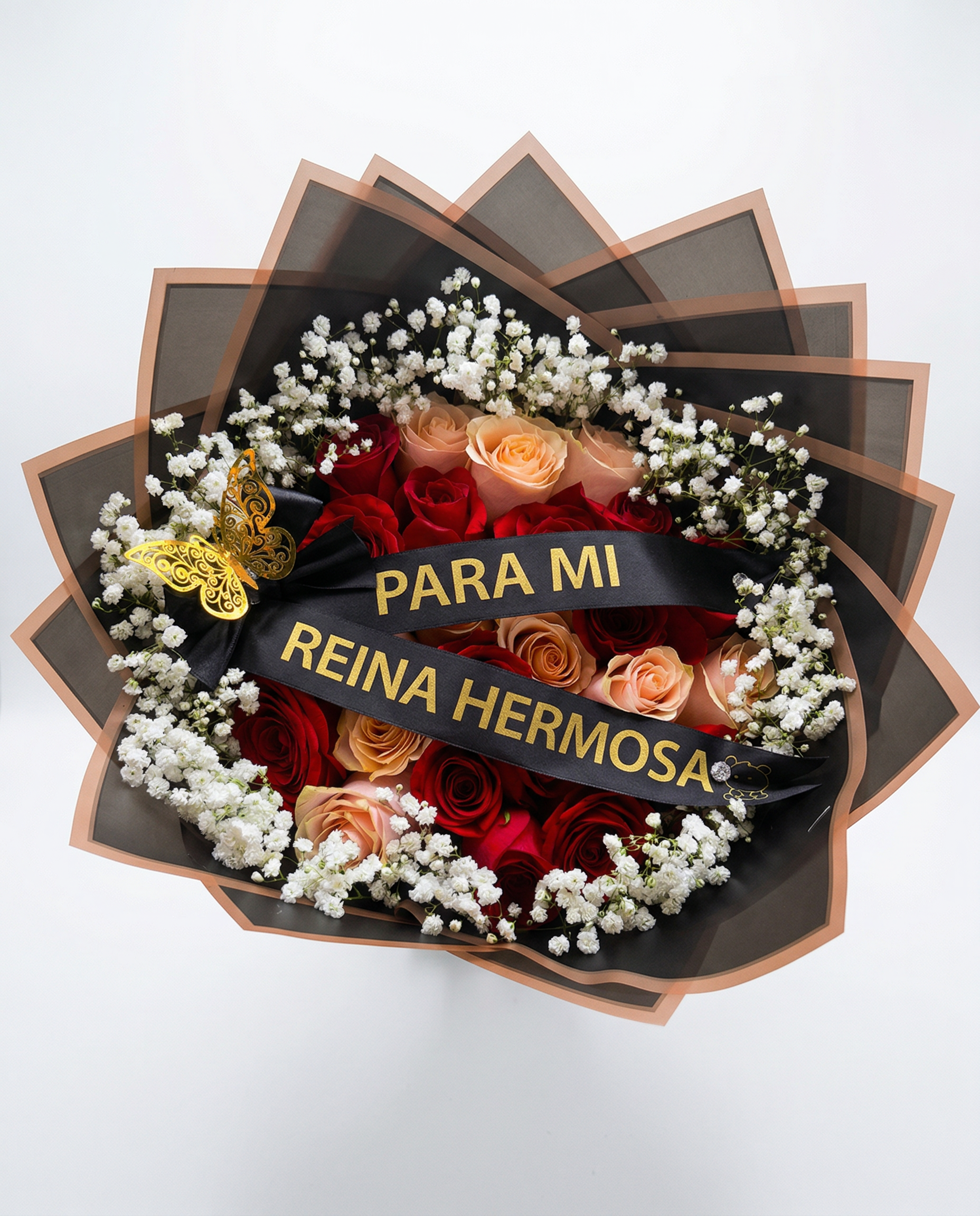 Toques de Distinción: Incluye una cinta de raso negra de doble lazo personalizada con el mensaje “PARA MI REINA HERMOSA” impreso en letras doradas elegantes. Además, una mariposa dorada de corte filigrana se posa con delicadeza sobre las flores, aportando un toque de encanto y exclusividad.