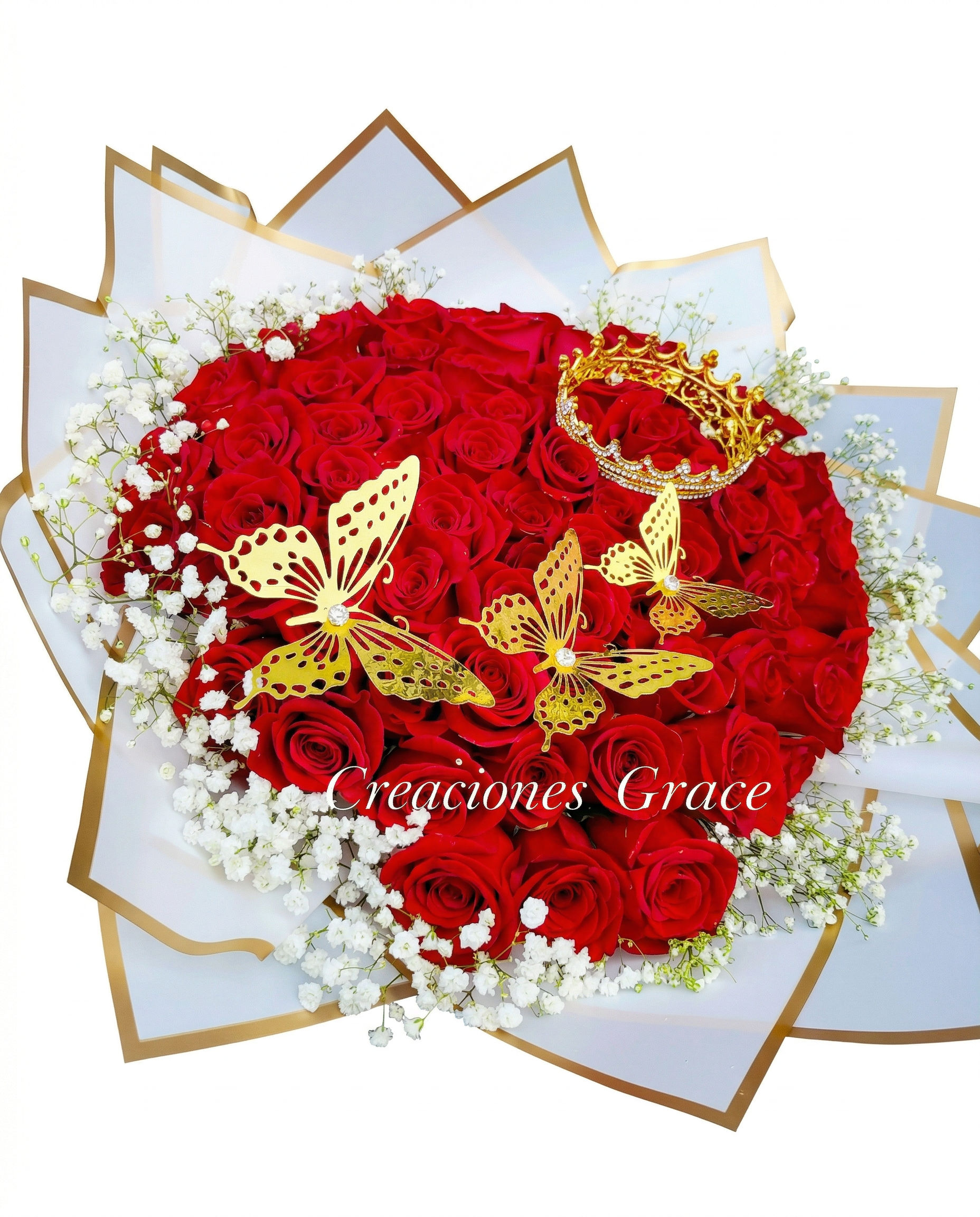 Arreglo floral premium de rosas rojas profundas, elegantemente enmarcadas con gipsofila blanca. Presentado en un envoltorio blanco con sofisticados bordes dorados, este ramo incluye una tiara de pedrería dorada y tres mariposas doradas filigranadas para un acabado lujoso y real. Una expresión inigualable de amor y elegancia.