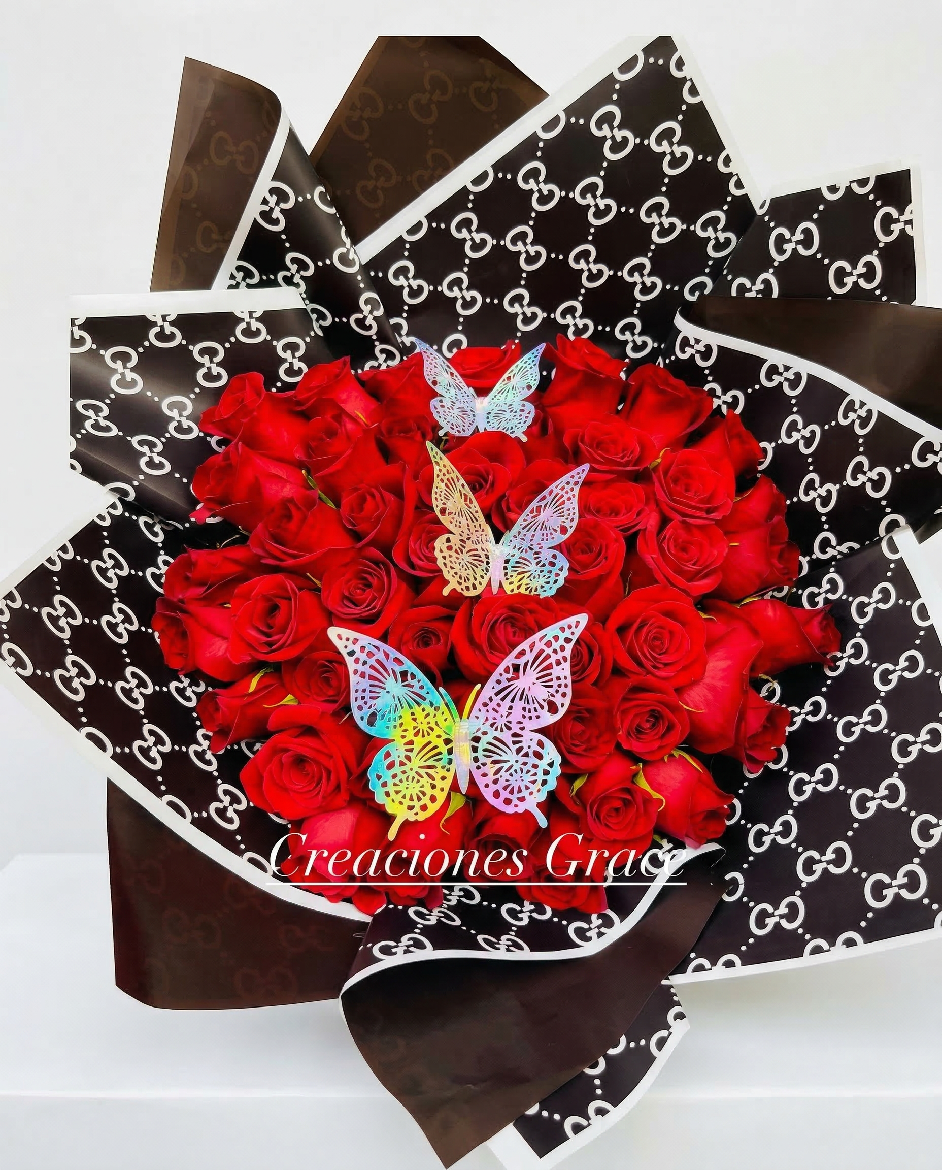 “Expresa tu amor con un brillo radiante. Este impresionante arreglo fusiona la pasión de las rosas rojas con la elegancia del papel de lujo con el logotipo de la marca. Un diseño de gran formato, envuelto en nuestro papel de lujo marrón y blanco. El regalo perfecto para iluminar el día de cumpleaños de alguien especial con alegría y elegancia.