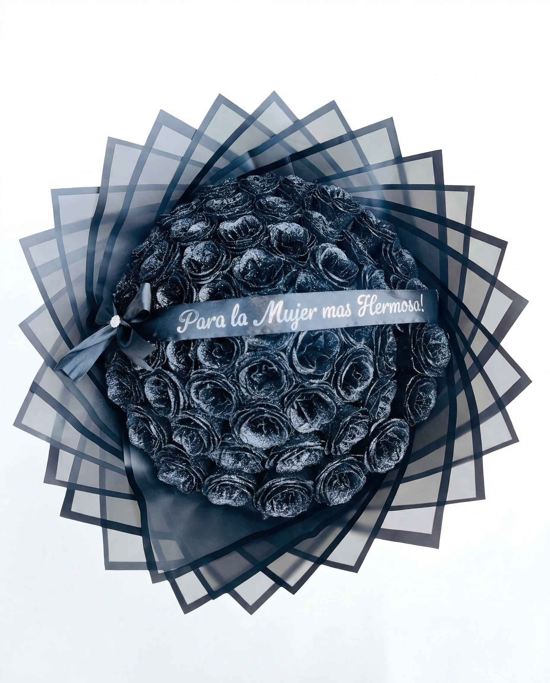 Eleva tu elegancia a un nivel superior con nuestro exclusivo Ramo “Destello de Medianoche”. Este diseño artesanal es la máxima expresión de misterio y sofisticación, creado para cautivar con su brillo enigmático y dedicatoria personalizada.