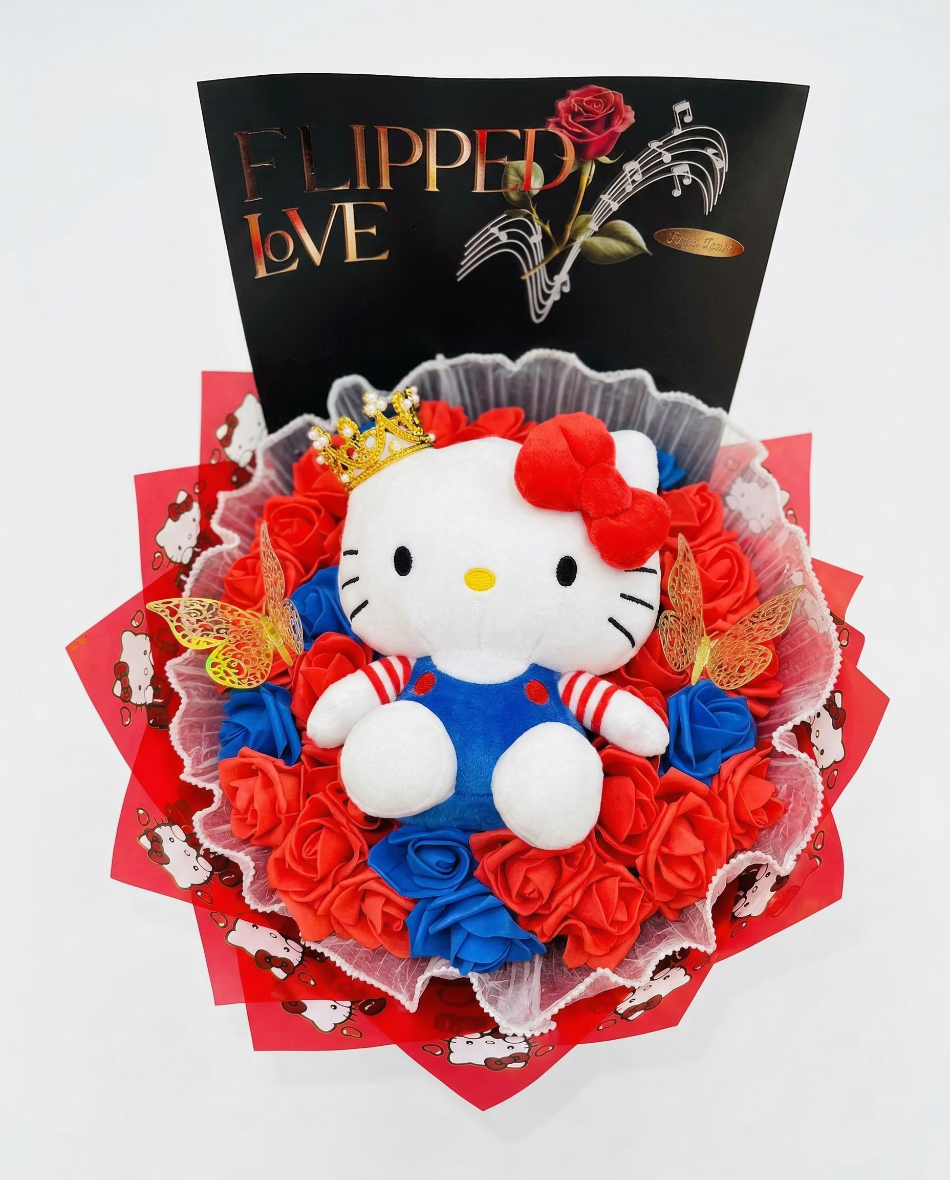 Elegante ramo temático de Hello Kitty en su versión clásica azul y roja. Incluye rosas eternas combinadas, peluche de Hello Kitty con corona dorada, mariposas de filigrana y un envoltorio artístico con notas musicales y detalles de perlas. Un diseño vibrante y sofisticado para cualquier ocasión especial.
