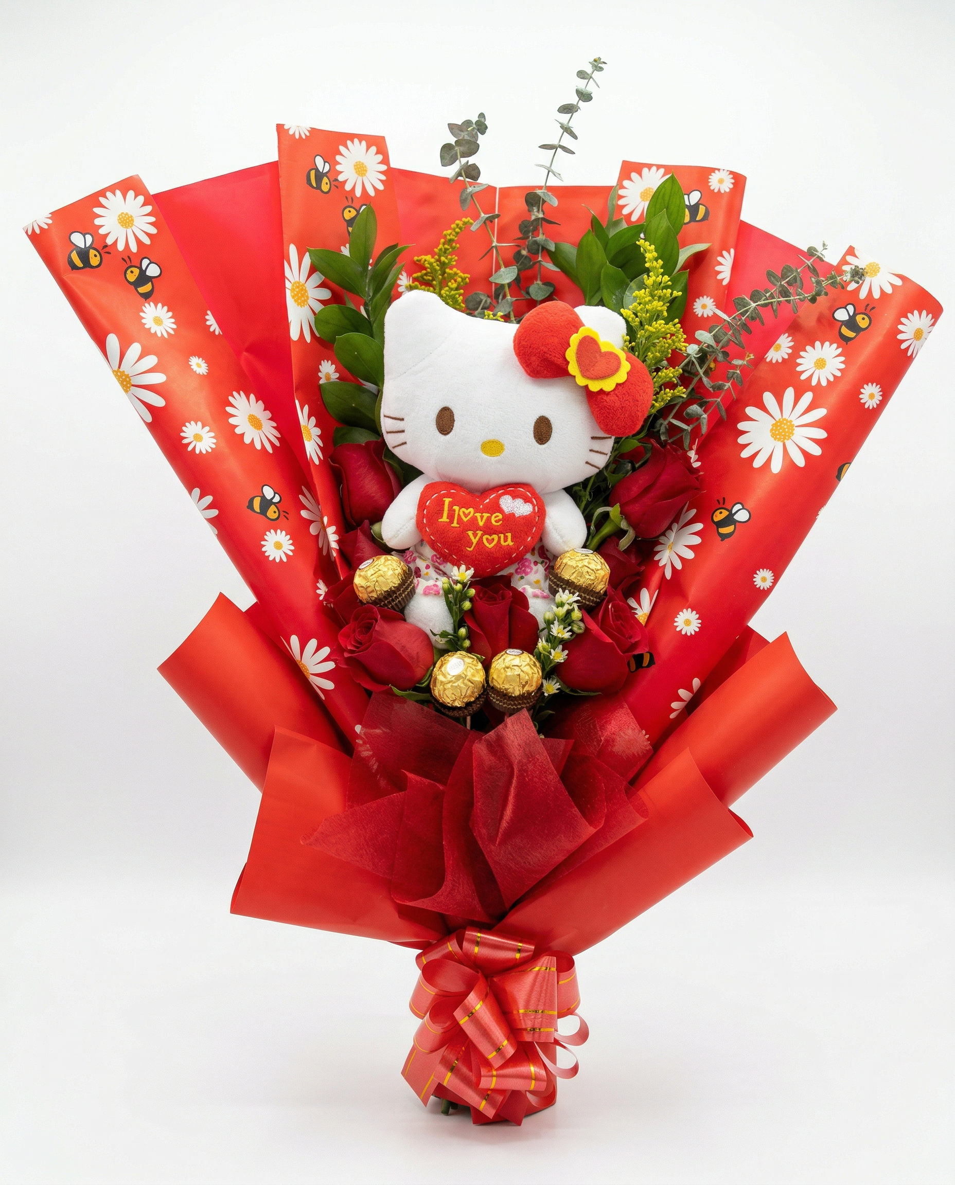 Protagonista Central: Incluye un peluche original de Hello Kitty sosteniendo un corazón rojo con el mensaje “I love you”, situado en el corazón del arreglo.