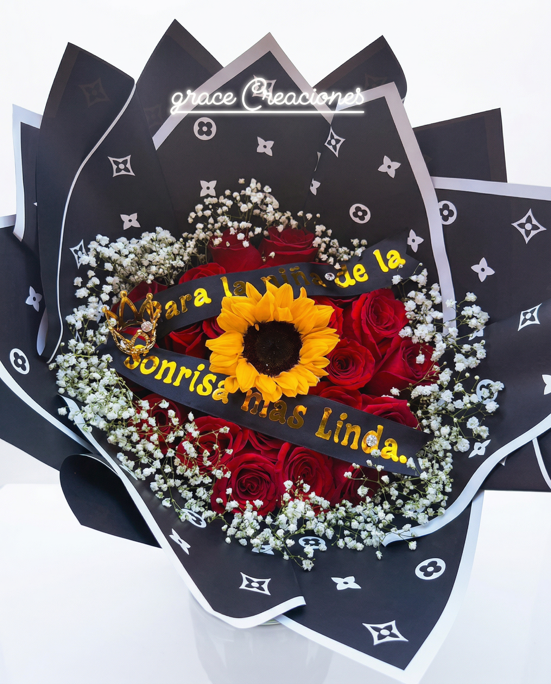 Este majestuoso ramo combina la fuerza del color negro con la calidez del sol, creando un contraste visual de alto impacto. Es un diseño pensado para quienes buscan un detalle que transmita admiración y lujo en un solo regalo.