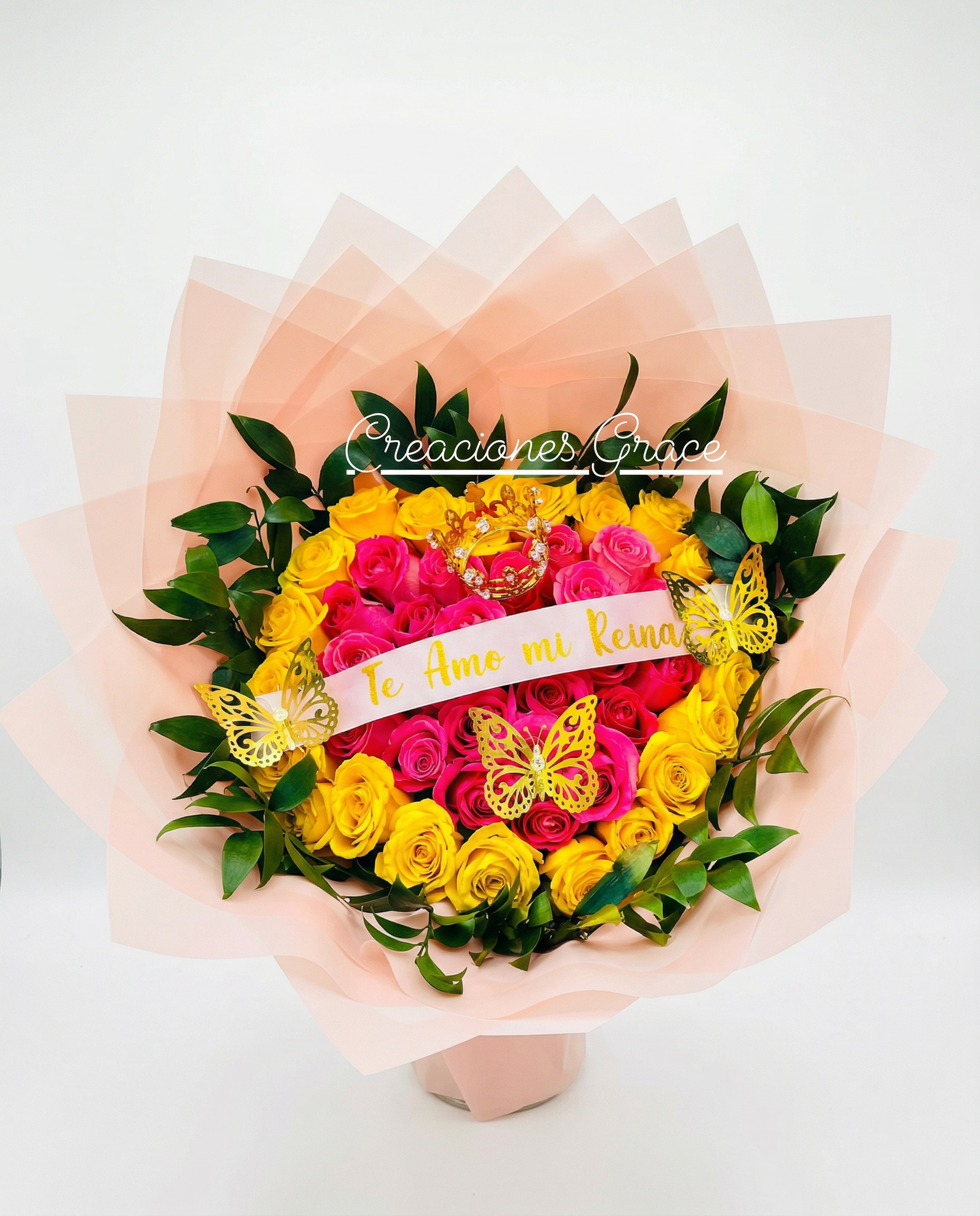 Impresionante arreglo de gran formato con un diseño bicolor de rosas fucsias y amarillas enmarcado en follaje verde. Este modelo de gala destaca por su tiara real dorada, detalles de mariposas en filigrana y un envoltorio en tono rosa melocotón de gran volumen. Incluye un listón personalizado con mensaje de amor en oro, ideal para sorprender con un detalle alegre, lujoso y lleno de vida.