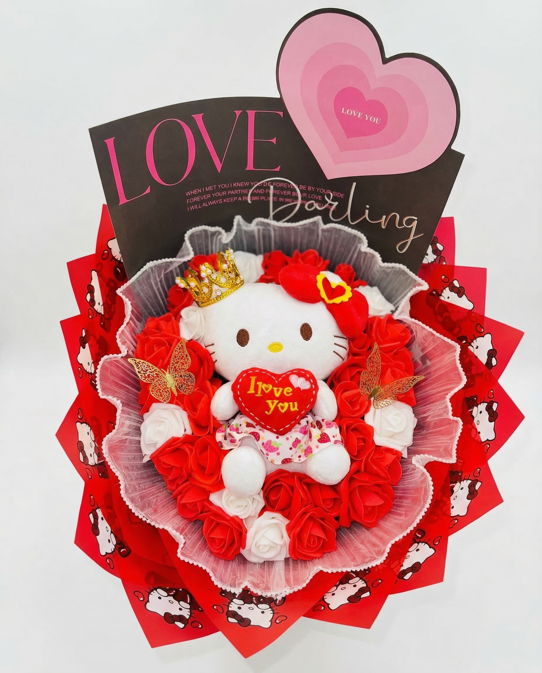 Bouquet radiante de rosas eternas en tonos pastel con una adorable Hello Kitty de peluche central, coronada y sosteniendo un corazón “LOVE YOU”. Incluye mariposas de filigrana dorada, envoltorio temático de Hello Kitty con detalles de perlas, y un lazo de satén rosa con encaje. Un diseño dulce, coquette y lleno de realeza.