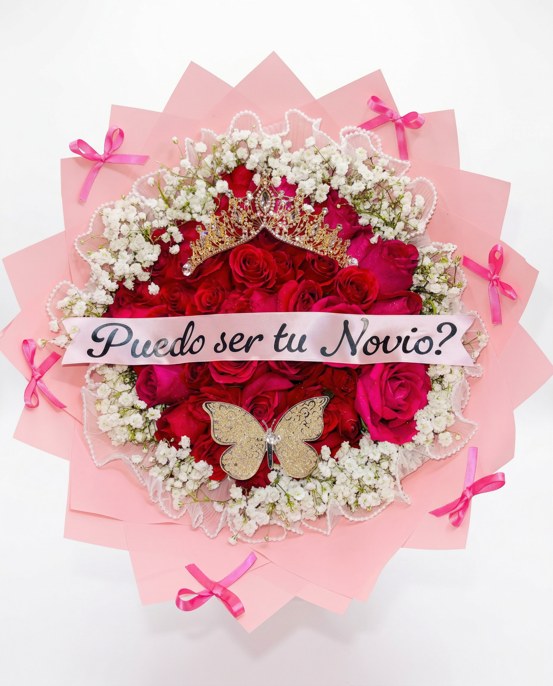• Detalles Coquetos: Decorado con múltiples lazos de satén rosa en las puntas del papel, una mariposa de filigrana dorada y un listón central con la pregunta más importante: “¿Puedo ser tu Novio?”.