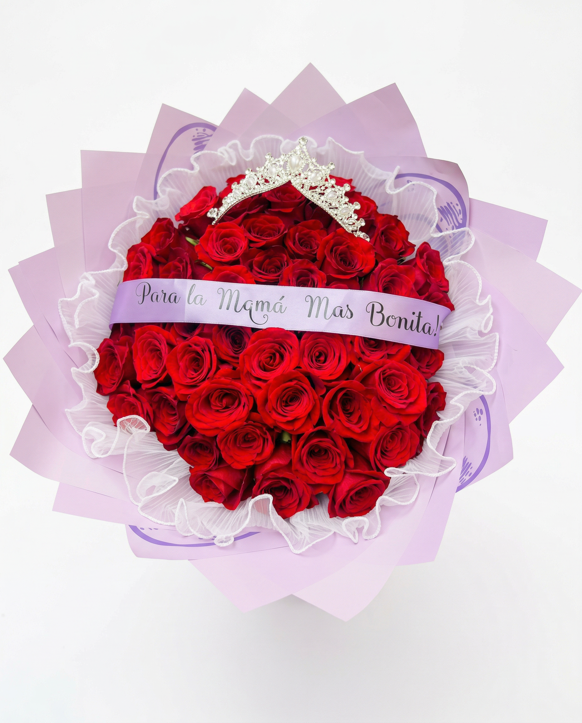 Exclusivo ramo de rosas rojas premium presentado en un sofisticado envoltorio color lavanda con bordes de tul plisado. Este modelo de gala destaca por su tiara real de perlas y cristales y un listón personalizado con un mensaje lleno de cariño. Es el regalo ideal para honrar a mamá con un detalle que combina elegancia clásica y un diseño moderno de gran volumen.