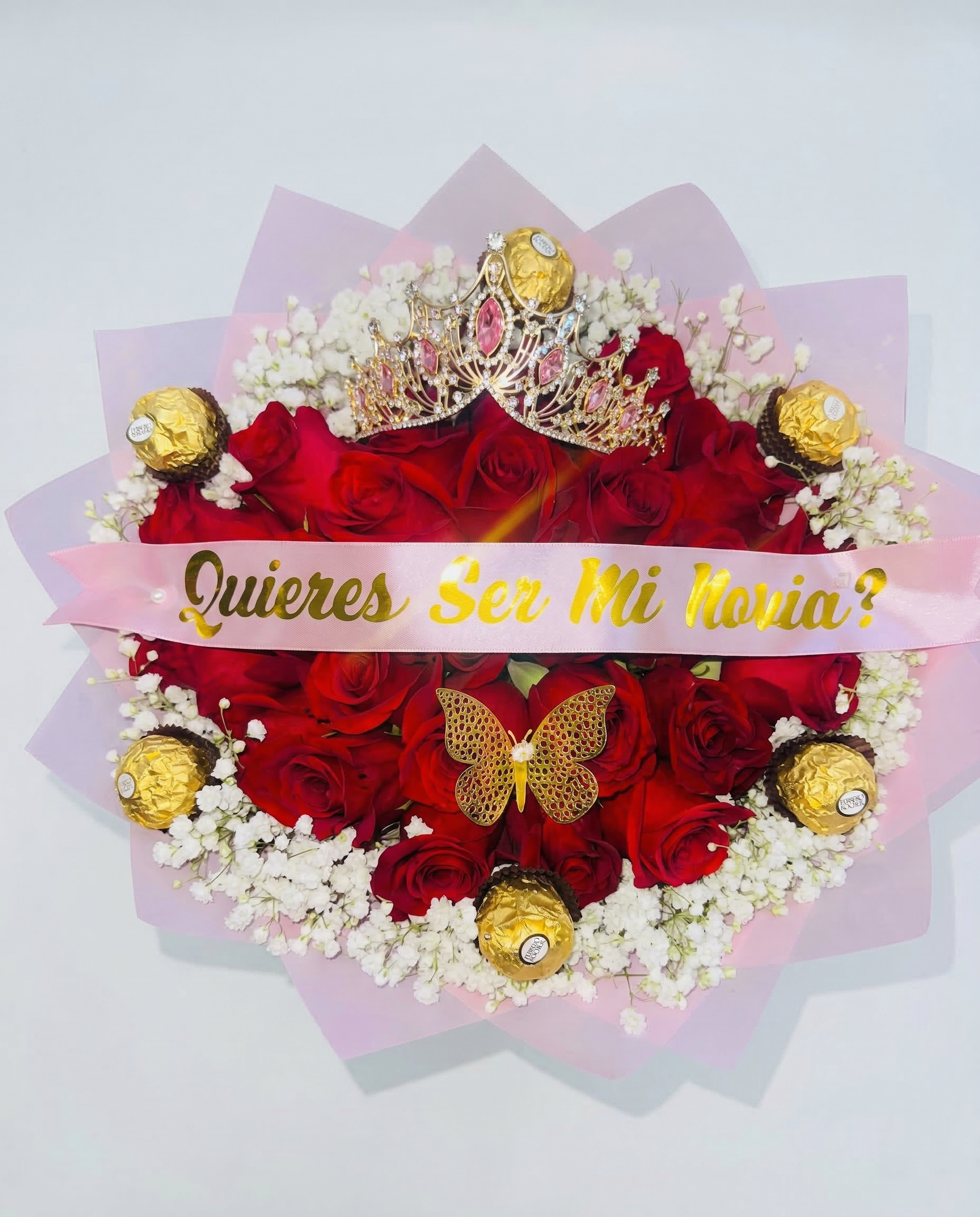 Cinta de Seda Personalizada: Una banda de seda rosa con la pregunta en letras doradas: “¿Quieres ser mi Novia?”, eliminando los nervios y dejando que las flores hablen por ti.